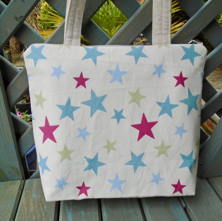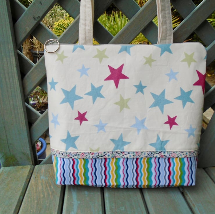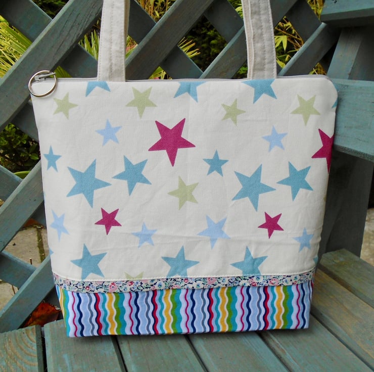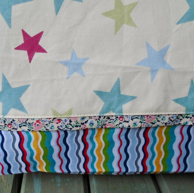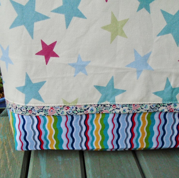 Made in a couple of lovely coordinating cotton fabrics , and a pretty floral cotton trim on the front .