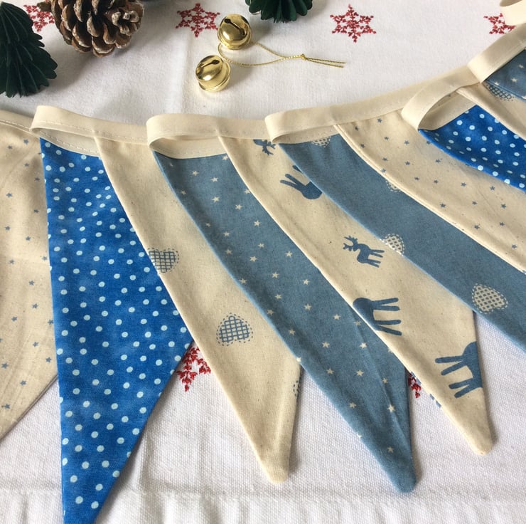New Christmas bunting for 2021, a 12 flag blue cream christmas bunting inspired by Scandi Christmas fabrics, comprising a of reindeer, stars, hearts on a cream background and plain red.