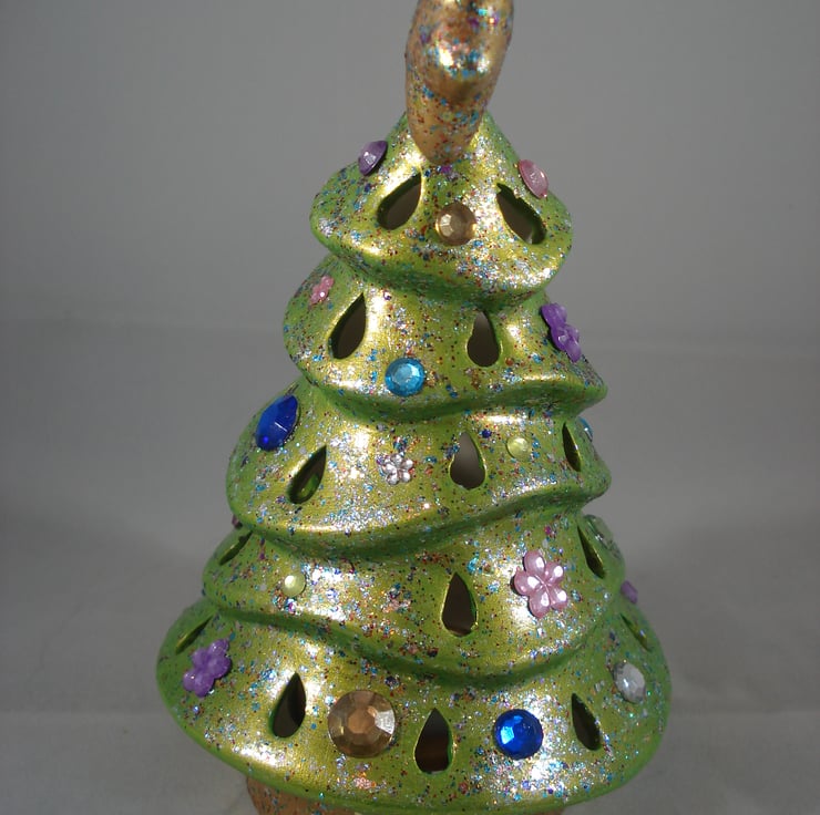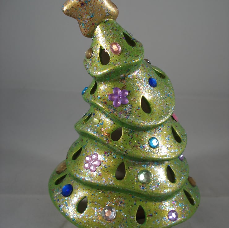 I have for sale a Christmas candle/tealight holder, which was hand painted by myself. It is a small green, glittery wonky Christmas tree, which has numerous small holes all over it, in between these it has been decorated with colourful gems. The tree stands on top of a gold glittery base, which is completely separate and holds the candle. Included in the sale is a free battery operated flickering tealight candle. This would make a lovely addition to anyone's Christmas decorations, or perhaps given as a gift.