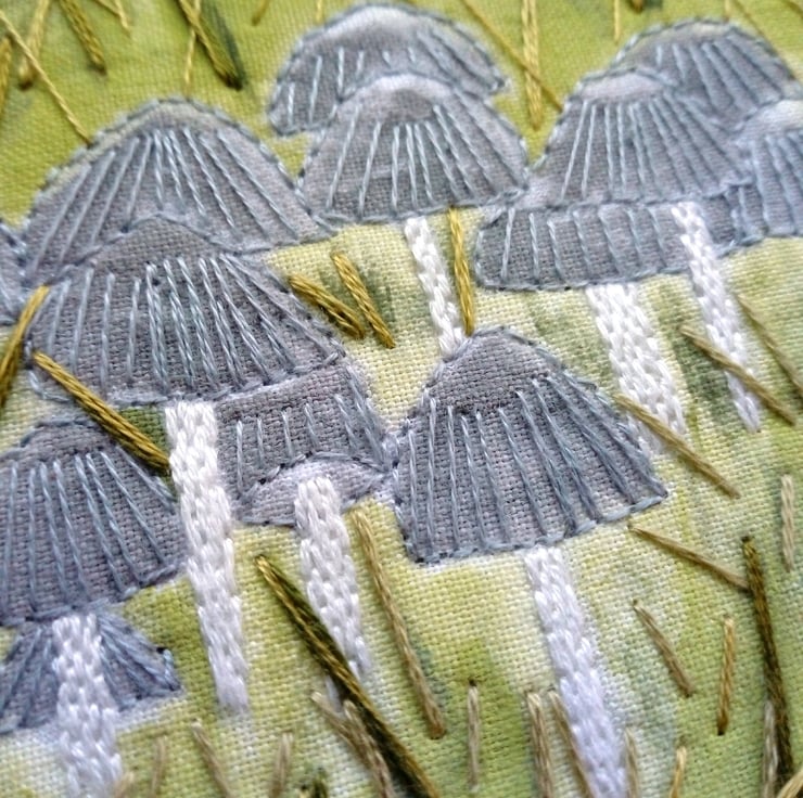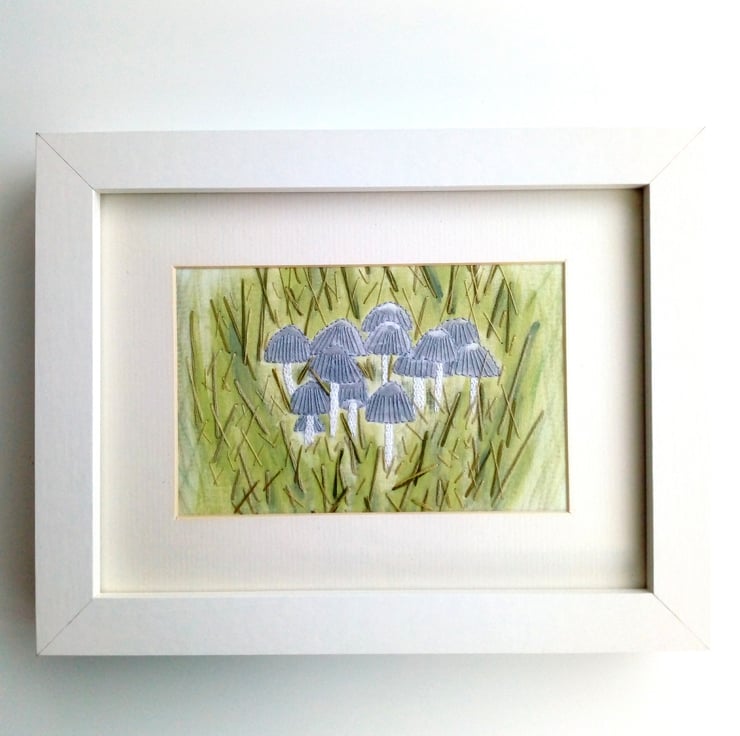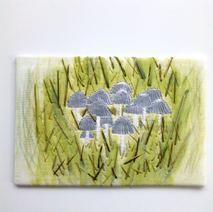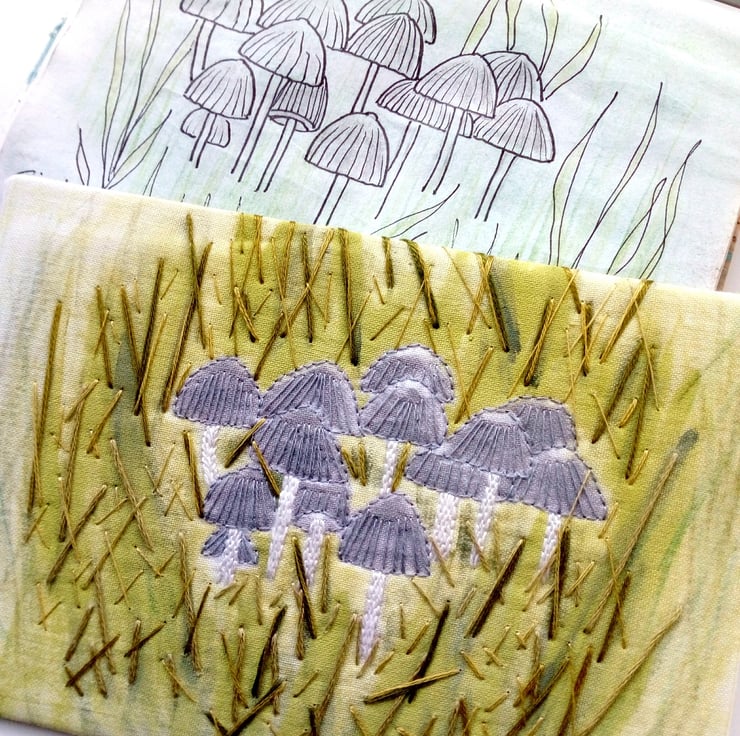 The background and toadstools were painted first, then once dry, hand stitched details were added using embroidery threads to give texture to the fungi and blades of grass.