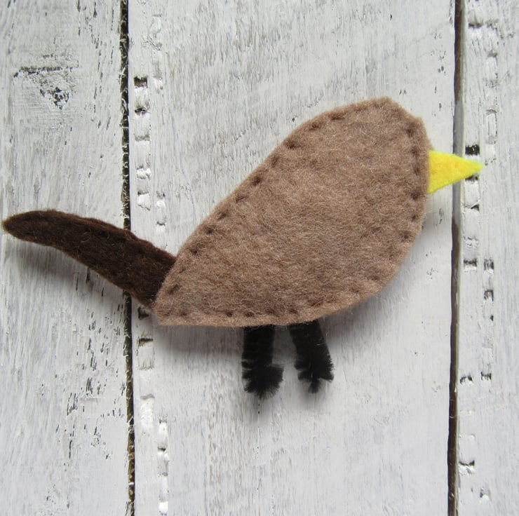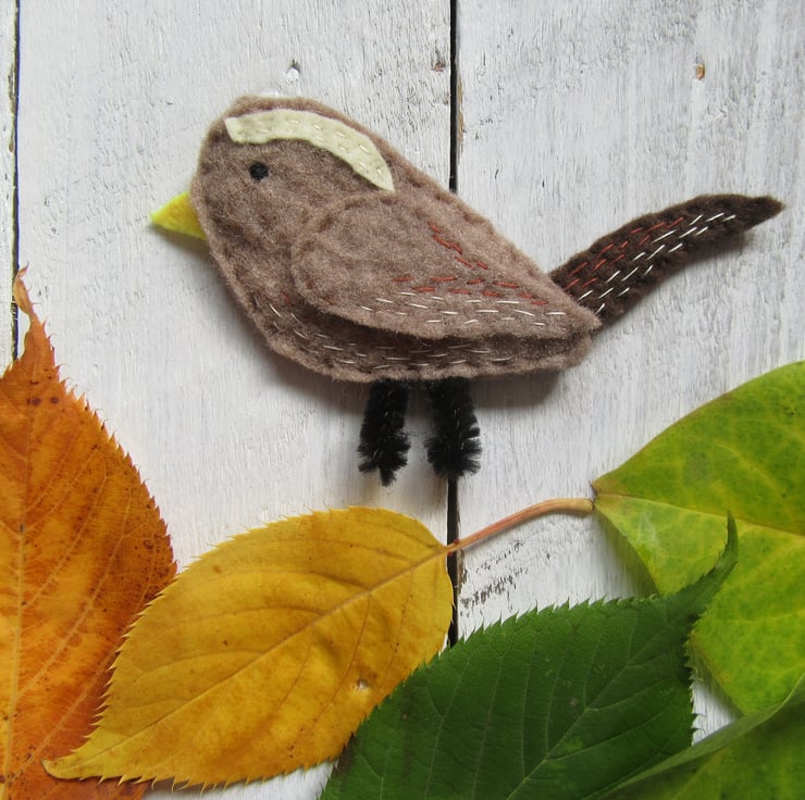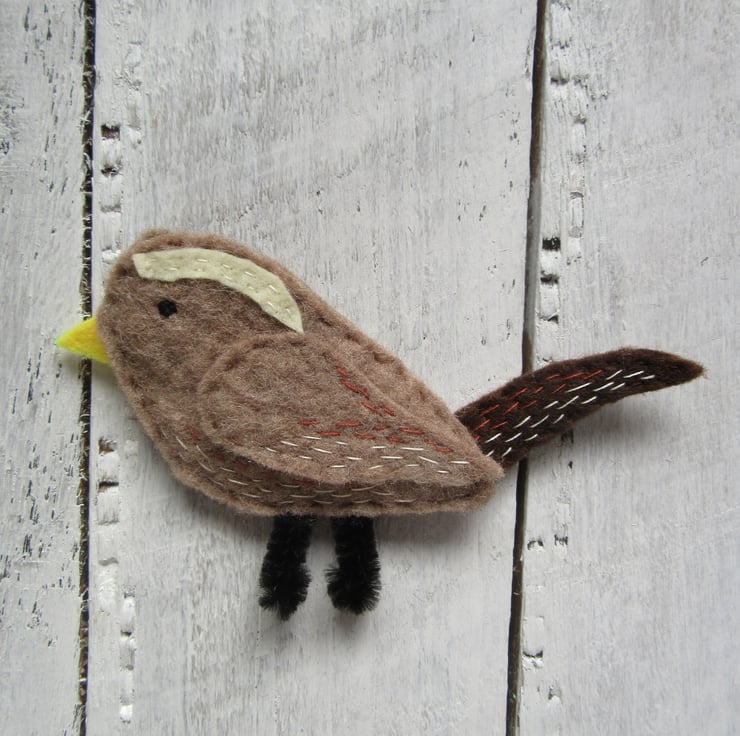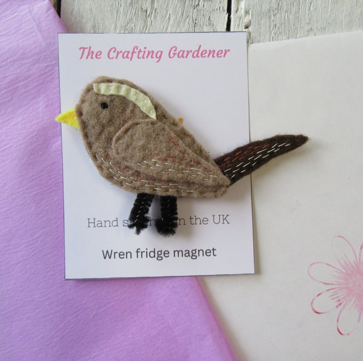 Hand stitched wren fridge magnet, made from 100% wool felt, which I have dyed brown. With acrylic felt details, black chenille pipe cleaner legs and hand embroidered feather details.