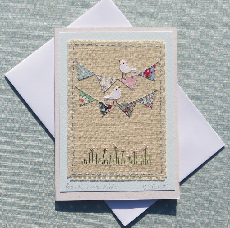 This is a small greeting card featuring a unique hand-stitched miniature applique with embroidered details. The bunting flags are hand cut from pretty cotton fabrics and the birds are cut from recycled cotton. Embroidered daisies and other details intricately stitched by hand complete the design. Perfect for many different occasions - engagement, Wedding or New Baby! Birthday too of course!