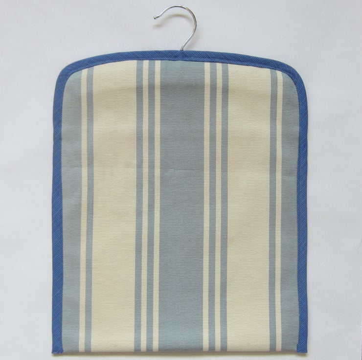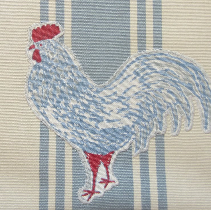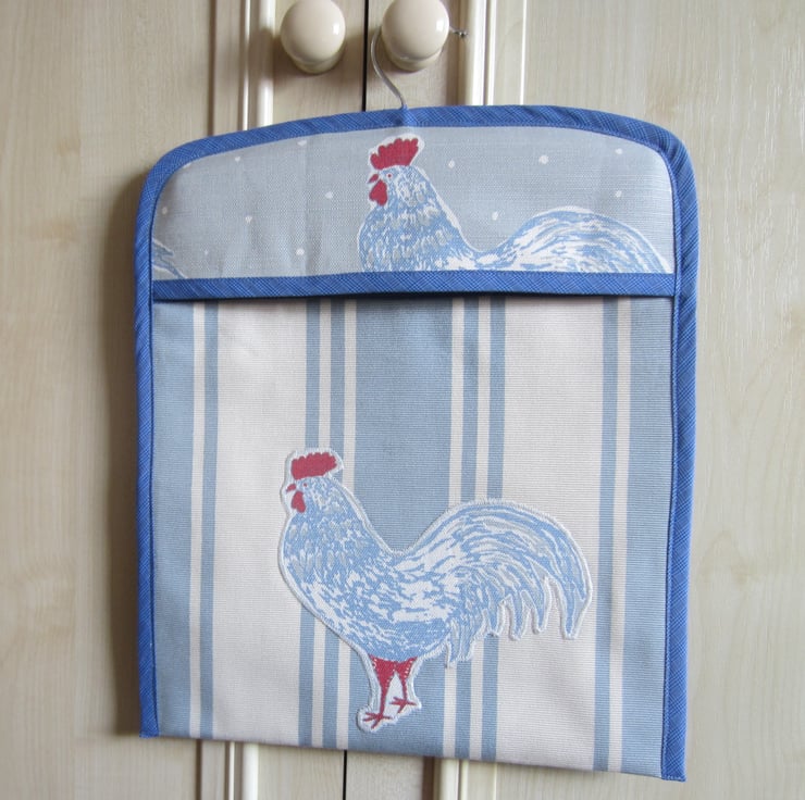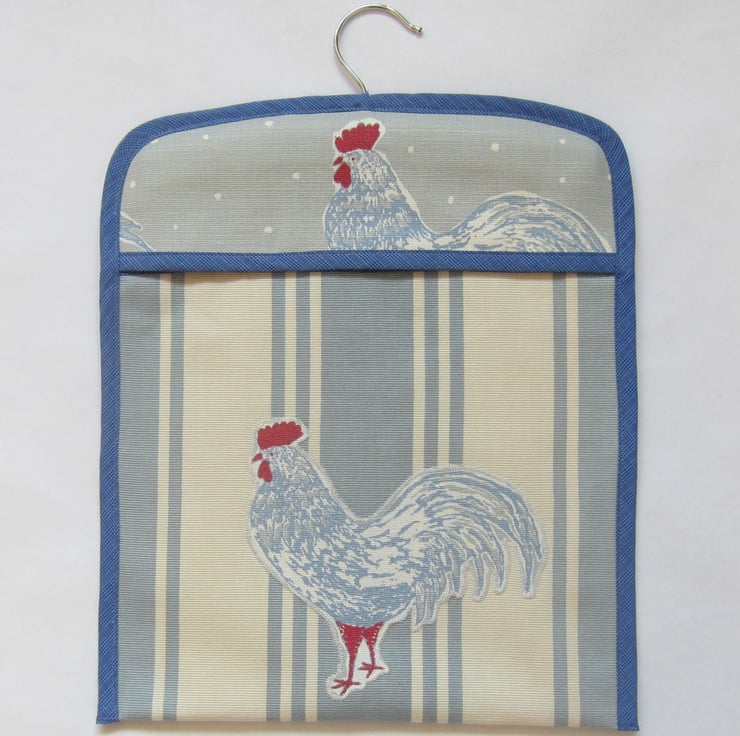 This sturdy peg bag is made with blue and cream striped fabric and decorated with an appliqued cockerel. The top panel is made from the matching cockerel fabric.