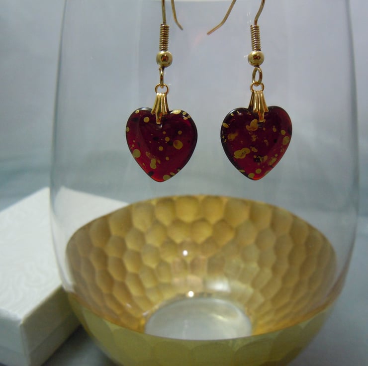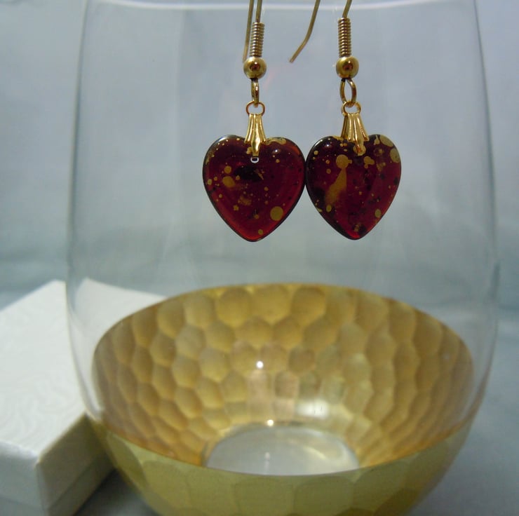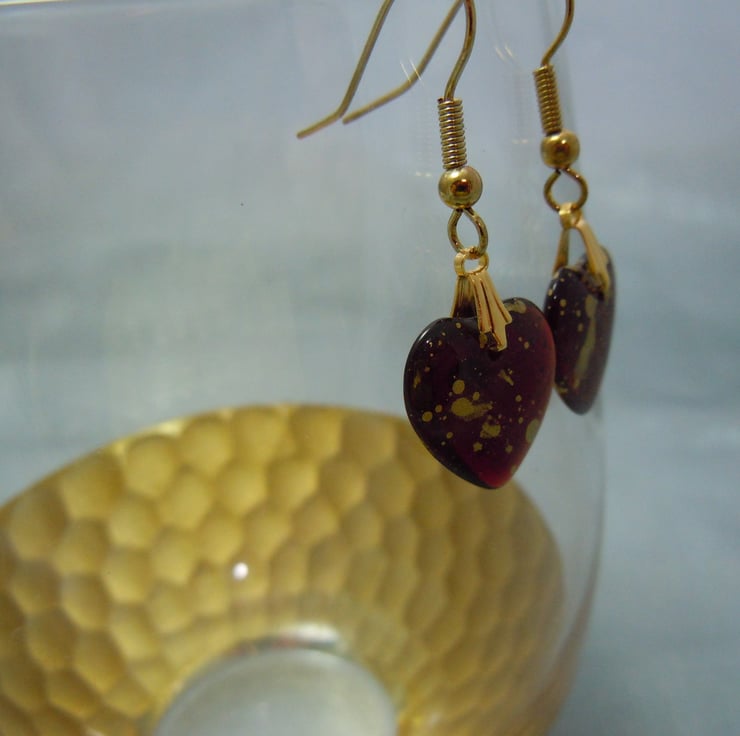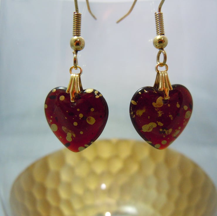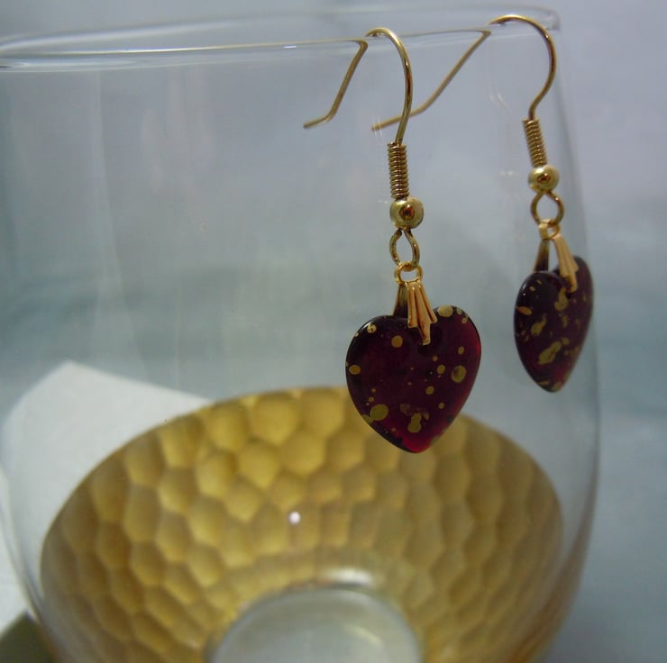 Gorgeous puffed heart shape Czech glass beads in dark wine transparent red with shiny gold metallic splatter mist with gold plate bail & ear wires. The light streams through these hearts, difficult to capture this in the photos.