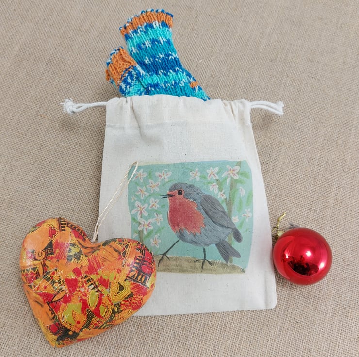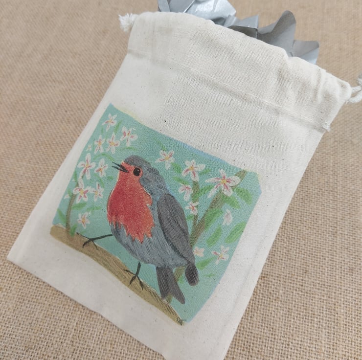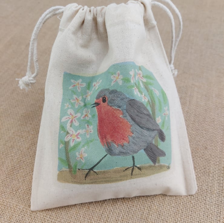 Small cotton drawstring bag, printed with my digital drawing of a robin. The picture is printed on both sides. The bag is suitable for small gifts and for small projects or treasures.