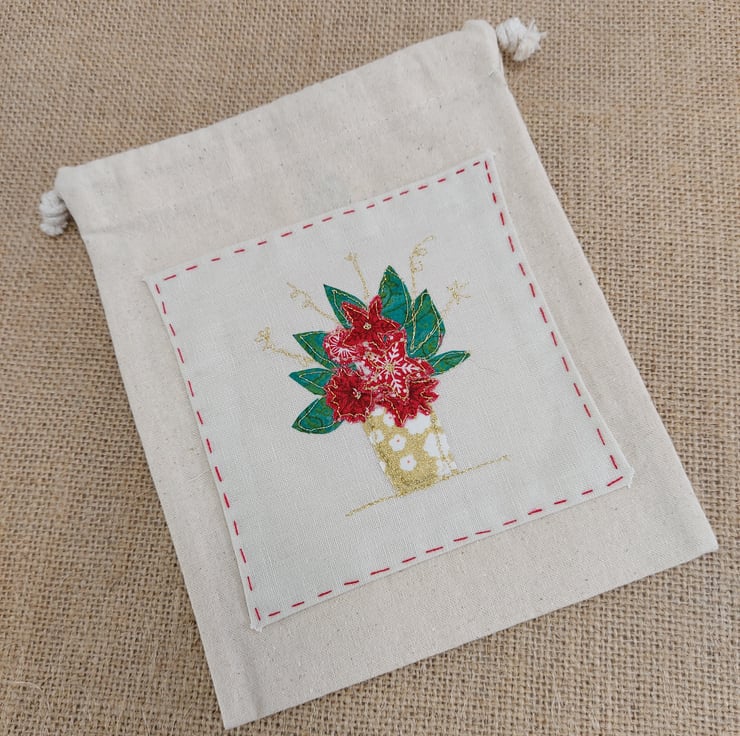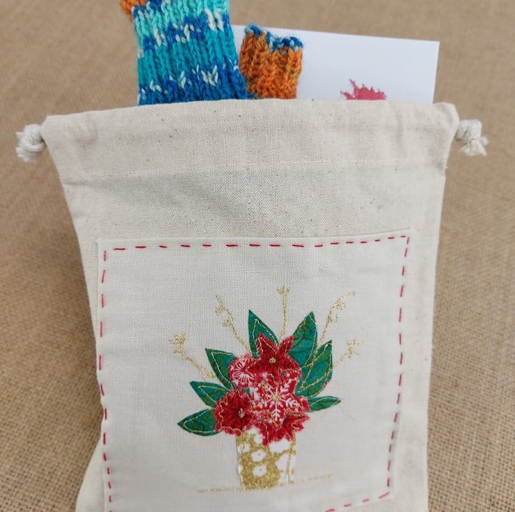 Small cotton drawstring bag, with machine applique design of stylised festive bouquet on one side.