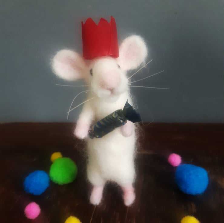 This fun little mouse is hand made using the art of needle felting. Layers of wool have been wrapped and sculpted over a wire armature. He has a layer of super soft white merino wool for his pelt, pink wool on his feet, hands, ears, tail and nose, glass eyes and horse hair whiskers. His little hat and cracker are hand made from card and tissue paper.