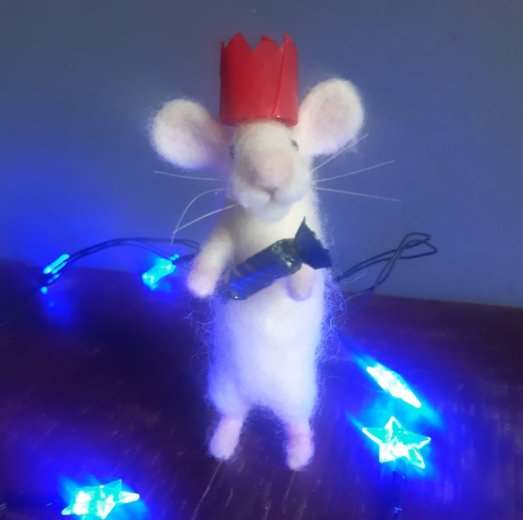 What a little cracker! This wee white mouse is wearing his red paper party hat and wants you to pull a Christmas cracker with him. He may have had a few too many sherries as he appears to have pulled some of the baubles off the tree, but hey, it's Christmas!