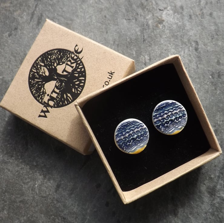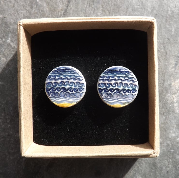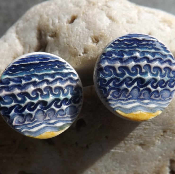 These stud earrings have a design of waves pressed into the wet clay, which have been painted different shades of blue and turquoise, with a touch of bright yellow sand at the bottom.