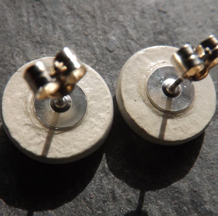 After forming the studs from fine white clay, I imprint the designs. When dry, I sand the sides and round off the edges to ensure they are super smooth to the touch. They then have their first firing. Next I paint them using under-glazes and apply a transparent glaze before firing again to earthenware. The ceramic is glazed on the front and sides and is very smooth whilst retaining the texture of the imprinted design. The result is a pleasantly tactile item.