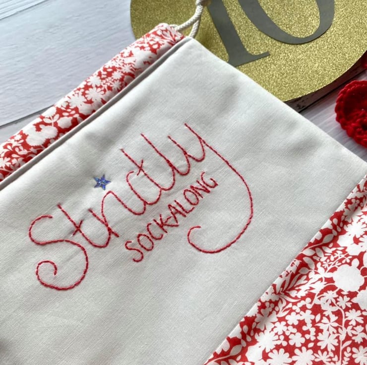 'Strictly Sock-Along' is hand stitched using DMC embroidery threads and the 'i' is embellished with a sparkly star sequin (Fab-u-lous, darling!)