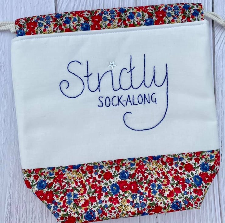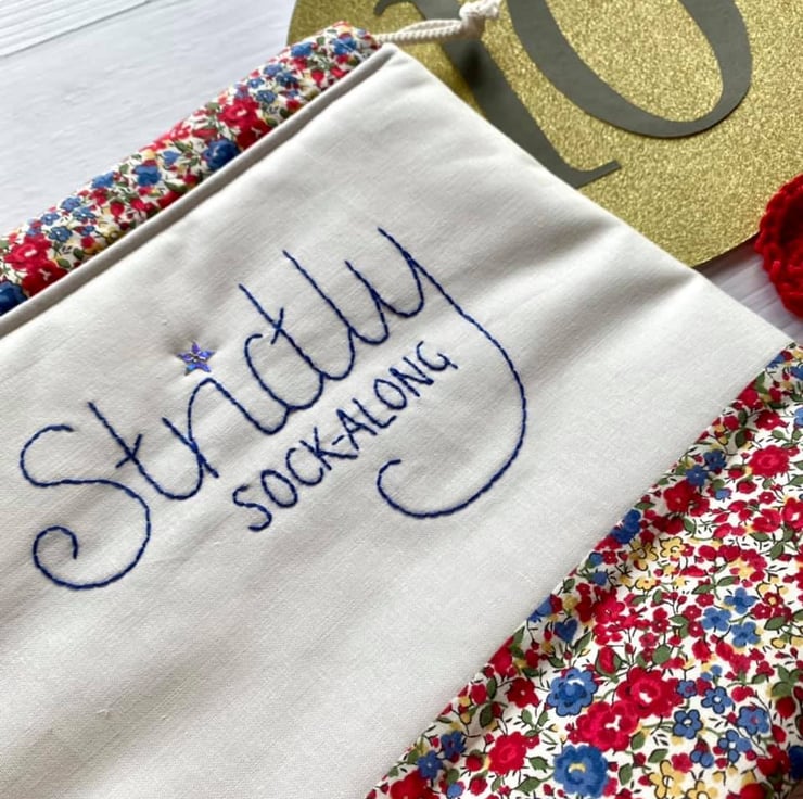 'Strictly Sock-Along' is hand stitched using DMC embroidery threads and the 'i' is embellished with a sparkly star sequin (Fab-u-lous, darling!)