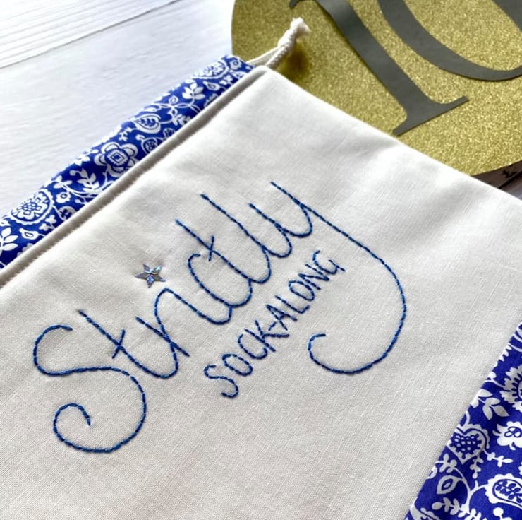 'Strictly Sock-Along' is hand stitched using DMC embroidery threads and the 'i' is embellished with a sparkly star sequin (Fab-u-lous, darling!)