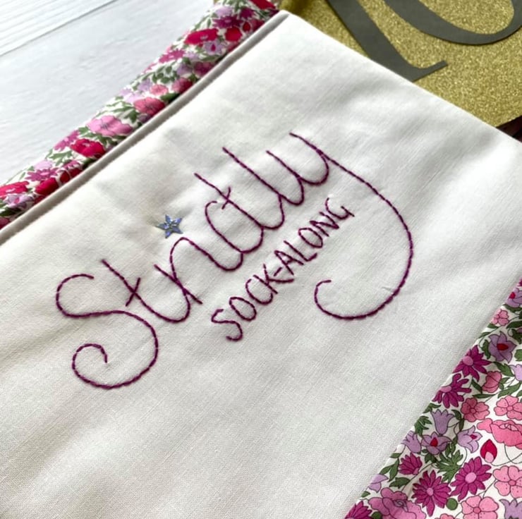 'Strictly Sock-Along' is hand stitched using DMC embroidery threads and the 'i' is embellished with a sparkly star sequin (Fab-u-lous, darling!)