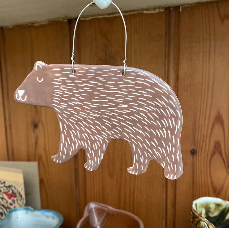 Each decoration is hand made from white earthenware clay. It is then decorated with a brown slip and a hand drawn fur design. A wire loop is fitted to allow the decoration to be hung.