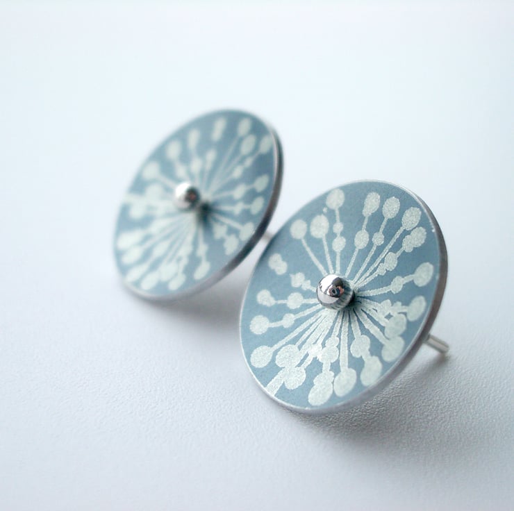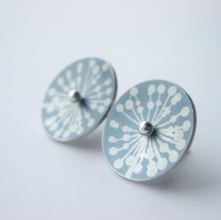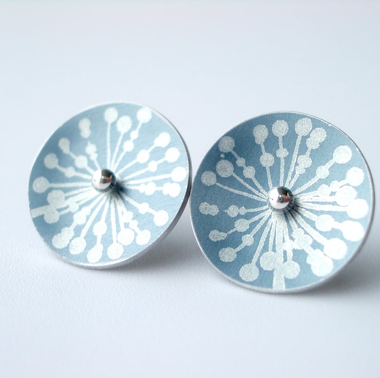 These silver and grey dandelion clock circle studs are made from aluminium which I have dyed and printed with a dandelion design. I seal in the dye which makes the colour a permanent part of the metal and the saw out the circle shape by hand, finally doming it inwards a little so that they catch the light when worn. Aluminium can't be soldered so the circle is fed on to a sterling silver post which when worn holds the circle in place on the earlobe by pressure from the butterfly behind.