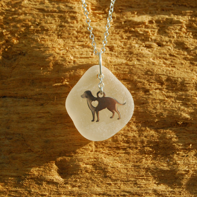 We rarely find such perfect pieces of sea glass as the one we've used to make this pretty pendant. It's probably come from an old bottle, as it curves gently behind the stainless steel dog charm. The rest of the metal in the pendant is sterling silver. The glass is beautifully frosted all over, as can be seen in the photos. The fineness of the frosting means it's come from a fairly sandy beach, rather than the rocky ones which make sea glass more coarse.