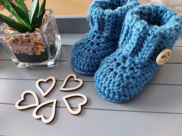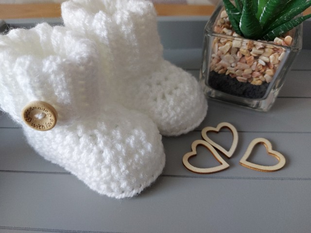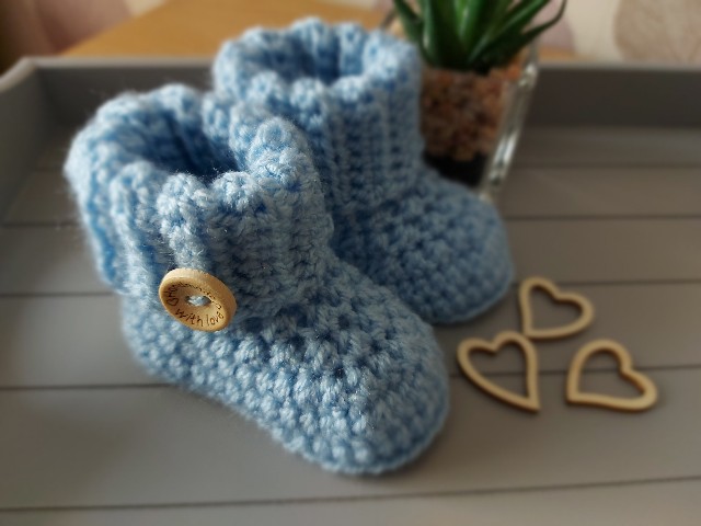 A pair of hand crochet baby booties with a ribbed cuff and finished with a 'handmade with love' wooden button. They are a great new baby gift.
