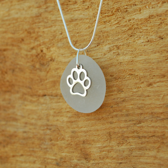 This is a perfect pendant for anyone who loves creatures with paws. The little charm is stainless steel and shines beautifully against the white sea glass. The glass is wonderfully frosted as can be seen in the photos. The frosting is fine which means the glass has come from a beach with sand and shingle. Sea glass shaped as perfectly as this piece is rare, and this fabulous piece goes perfectly with the charm.