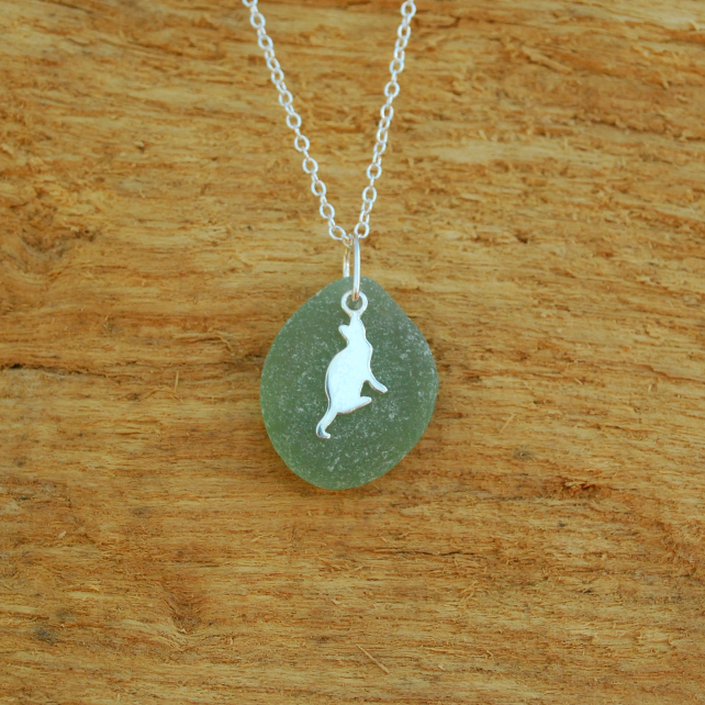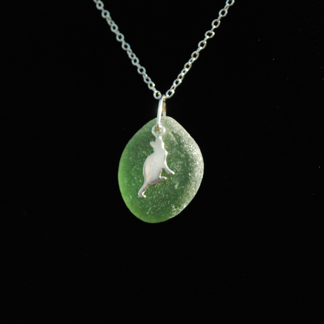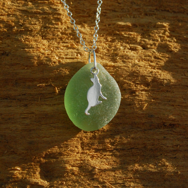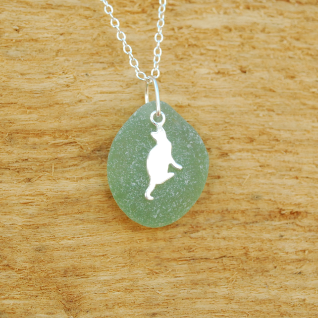 Sea glass tends to be either light or dark. This pretty pendant is a beautiful mid aquamarine colour, which shows off the sterling silver cat. The glass is unusually perfectly shaped and quite thick, which suggests it's come from a much larger piece of glass and has been tossed around by the sea for a very long time.