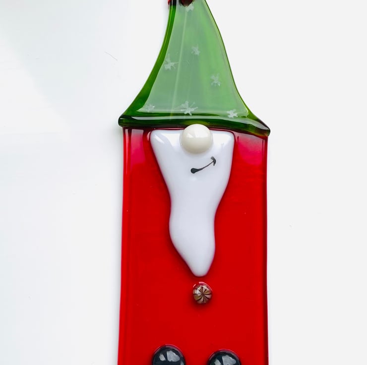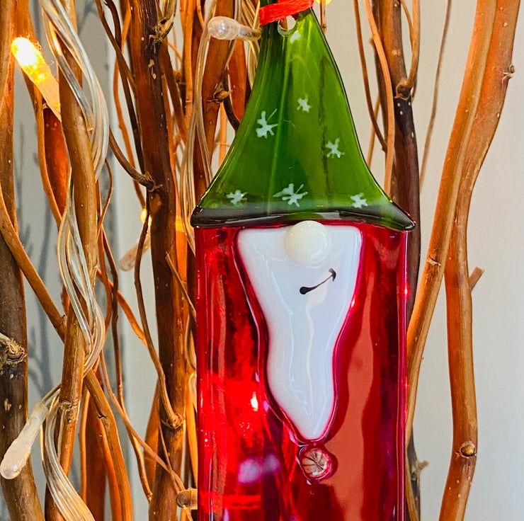 Large fused glass gnome Christmas decoration to hang on your Christmas tree or anywhere else you fancy in your home . He looks great with my smaller listed gnomes . He is approximately 5 inches long and 2 inches wide made from fused glass in my kiln . The gnomes hat is carefully drilled and strung with satin ribbon .