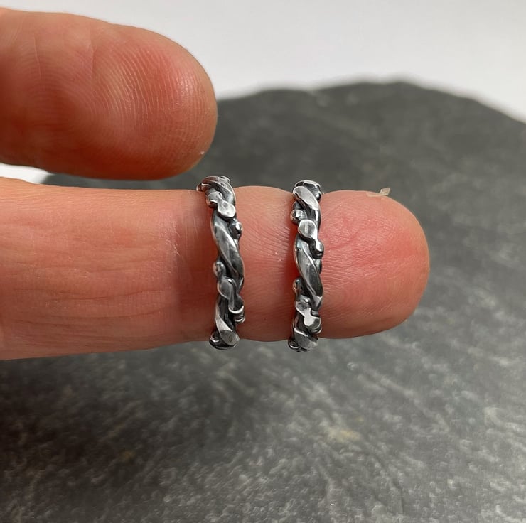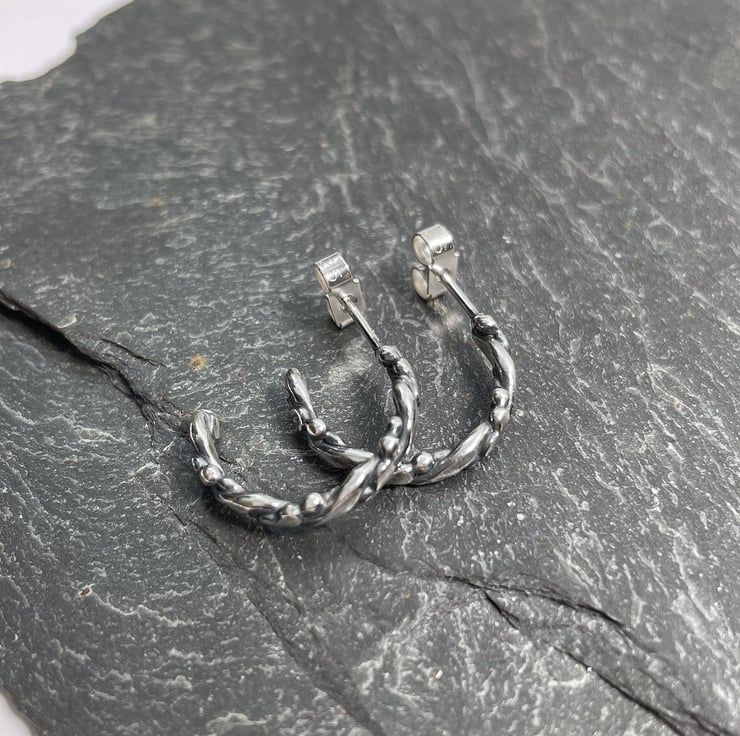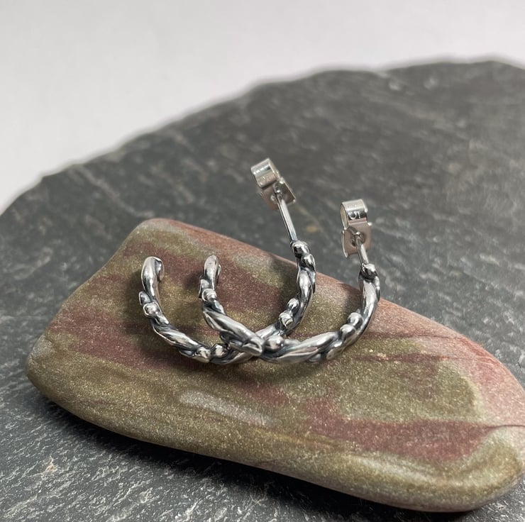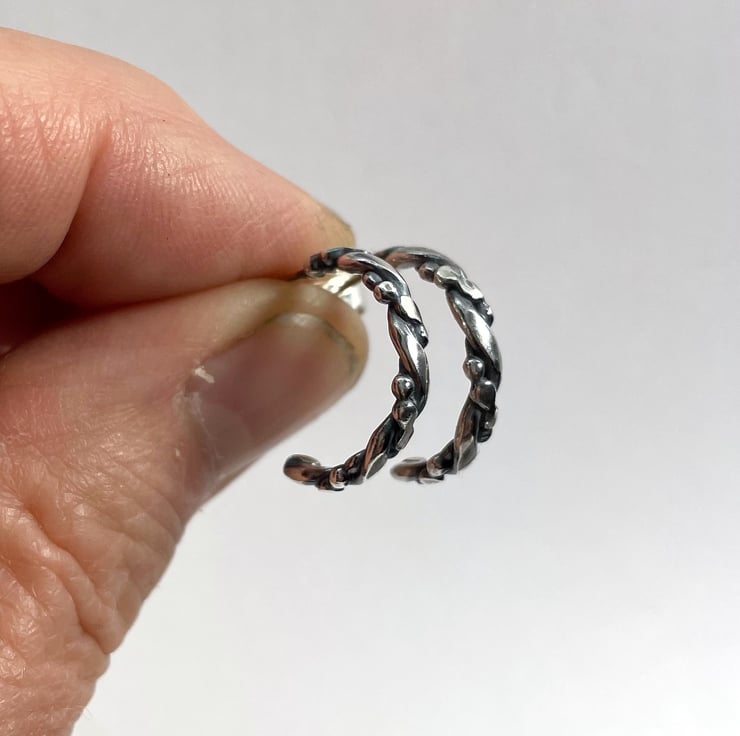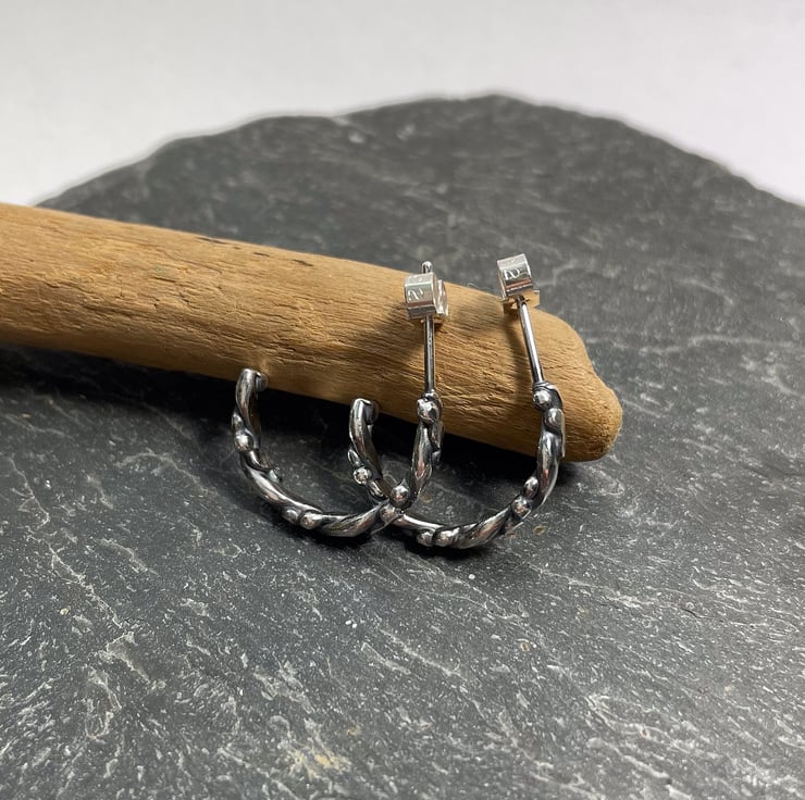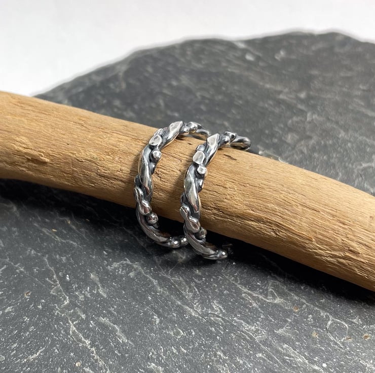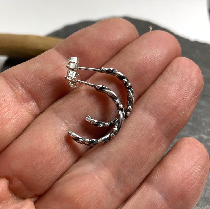 Hoop stud earrings with a twisted wire pattern, oxidised silver.