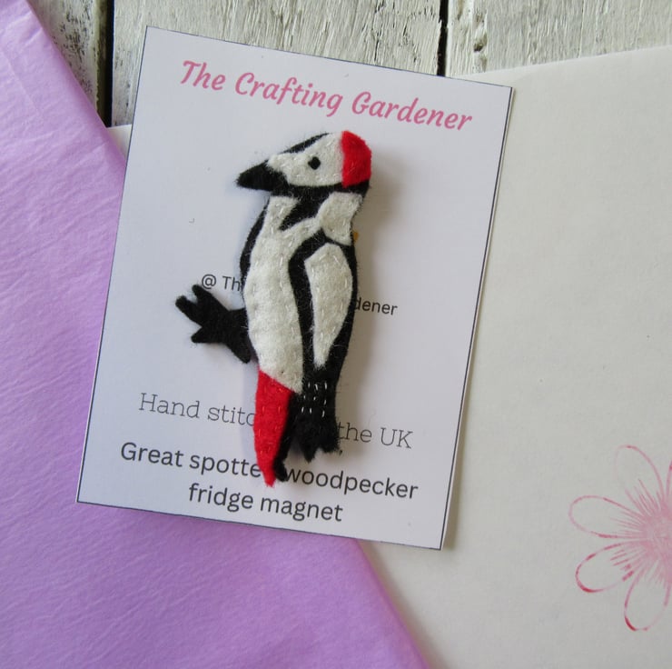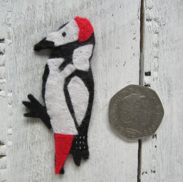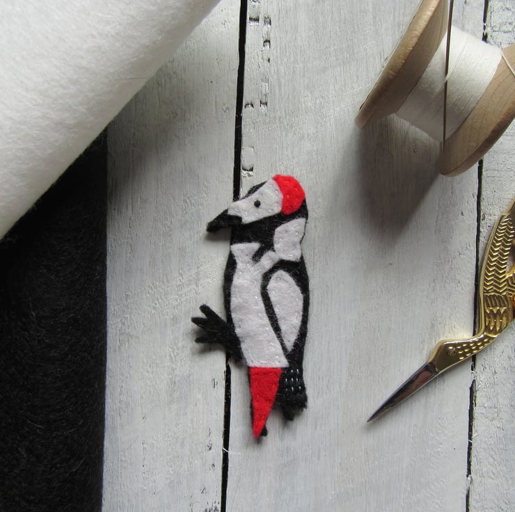 Great spotted woodpecker hand stitched from black and white felt, with striking red flashes and hand embroidered details.