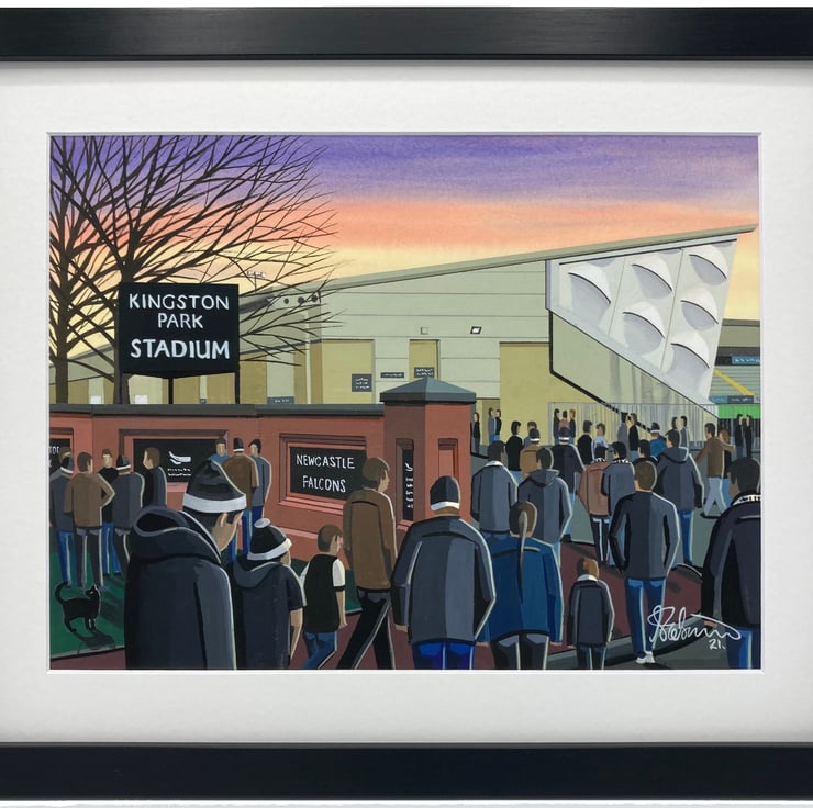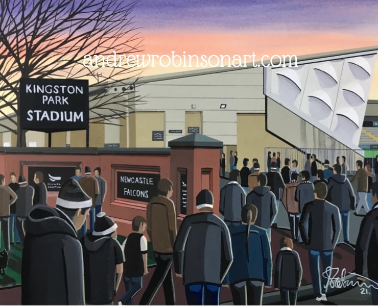 Titled ‘Sping Sun at the Kingston.’ this is a unique Newcastle Falcons print direct from myself the artist. My artworks are a celebration of the match day experience and of stadium architecture.