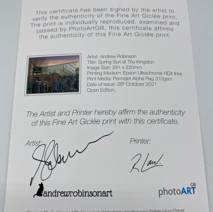 The framed print comes with a 'Certificate of Authenticity' which documents the details of the original painting and the art print. The Certificate of Authenticity is affirmed with a signature from both myself (the artist) and the printer.