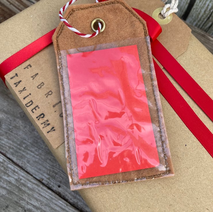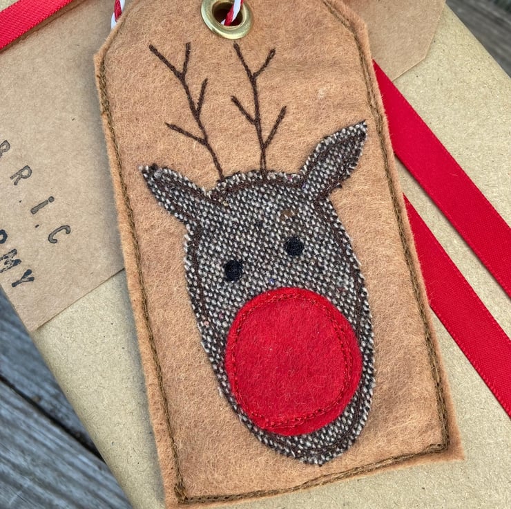 Hand made Gift tag featuring a Reindeer. The gift tag is made using felt and cotton fabric, layered together and outlined with free motion embroidery. On the back of the tag is a clear plastic pocket to insert the gift details. So the recipient of the gift can remove their name and insert the new name, reusing the tag many times