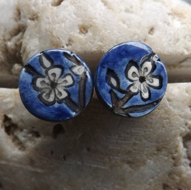 These pretty little circular studs have blackthorn blossoms with a deep blue background. They are from a range of hedgerow themed accessories.