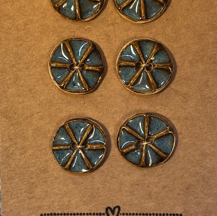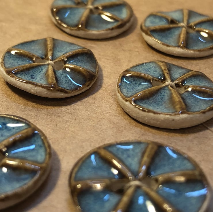 These textured buttons are handcrafted and fired in my small home studio. The design is formed from pressing an old button from my mum’s button box into clay. After bisque firing, the buttons were finished with a rutile blue glaze to highlight the texture. As each individual button is handcrafted, no two buttons will be exactly the same.