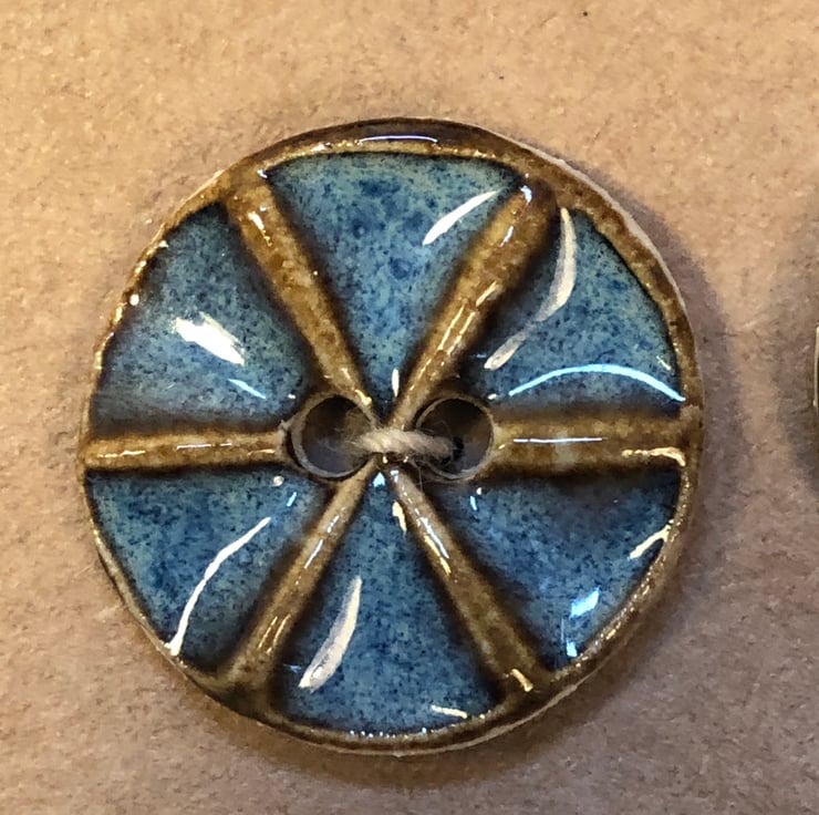 The buttons are bisque fired before being glazed. They are then fired a second time to stoneware temperature which gives them great strength and allows them to be machine washed. The sides and backs are not glazed, leaving them with a natural ceramic finish.