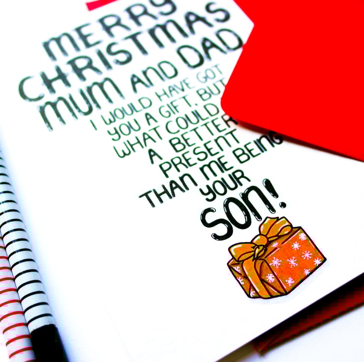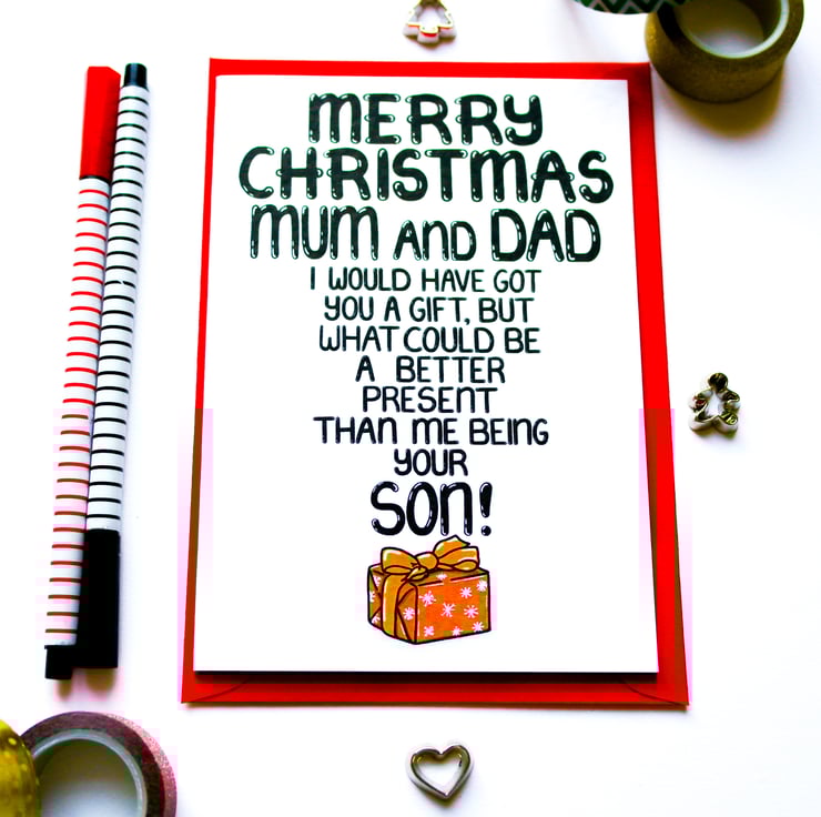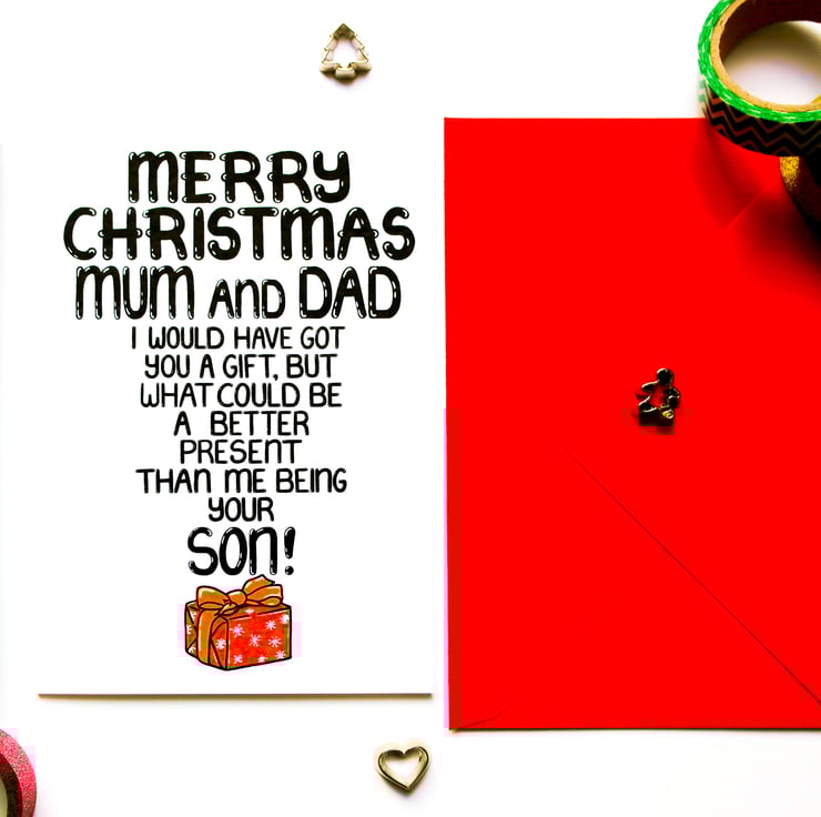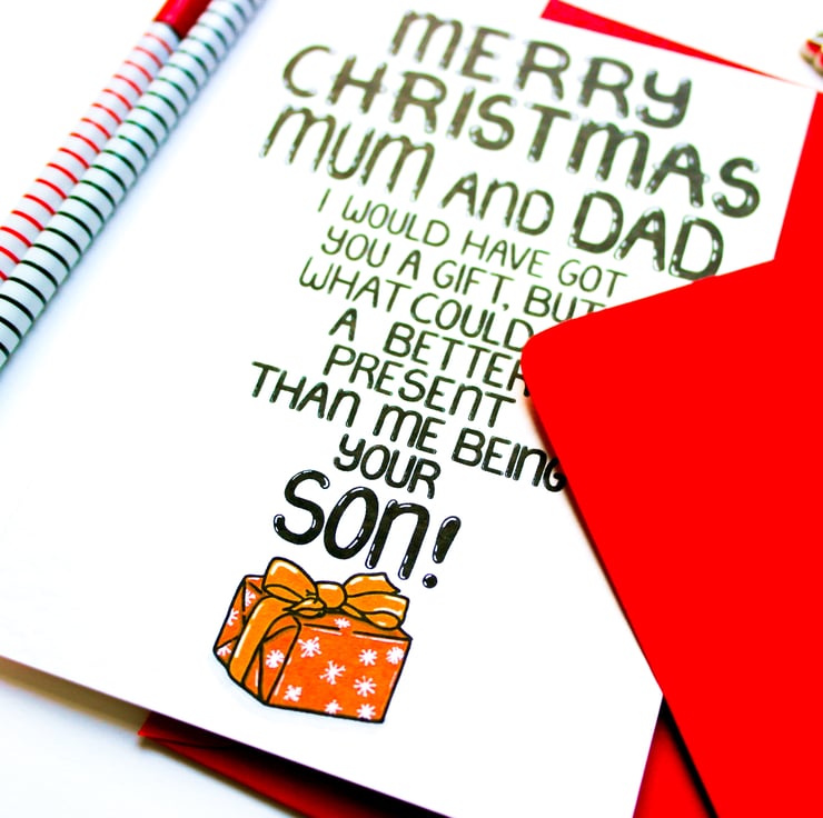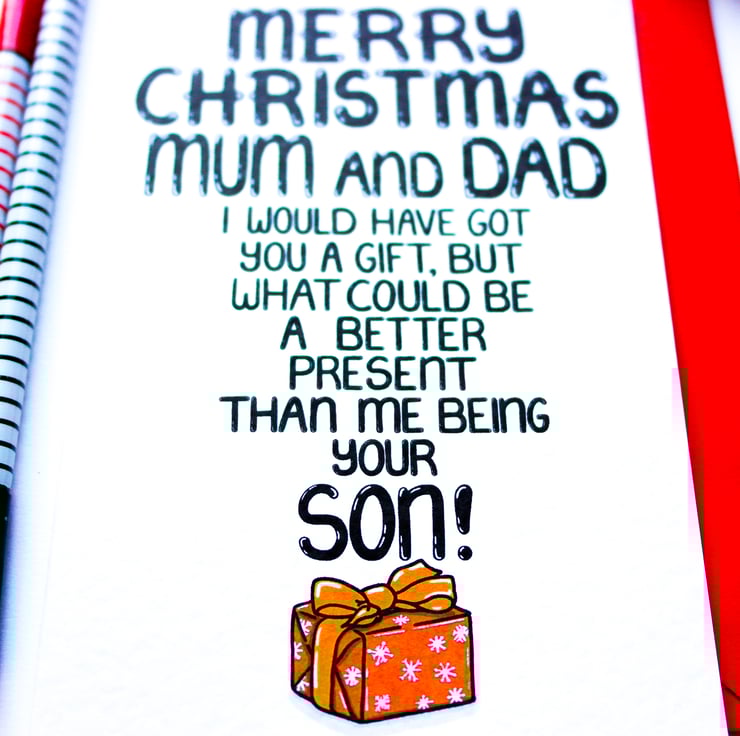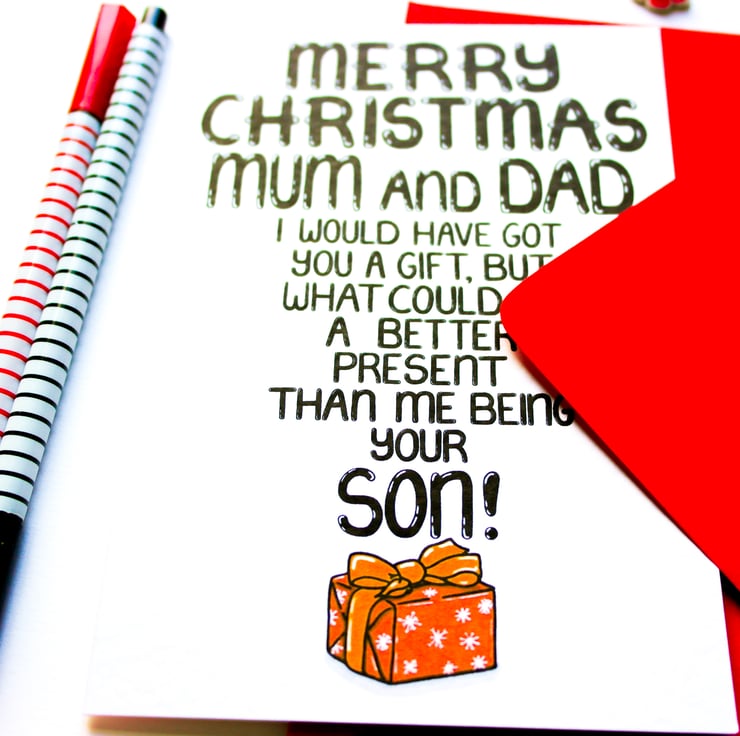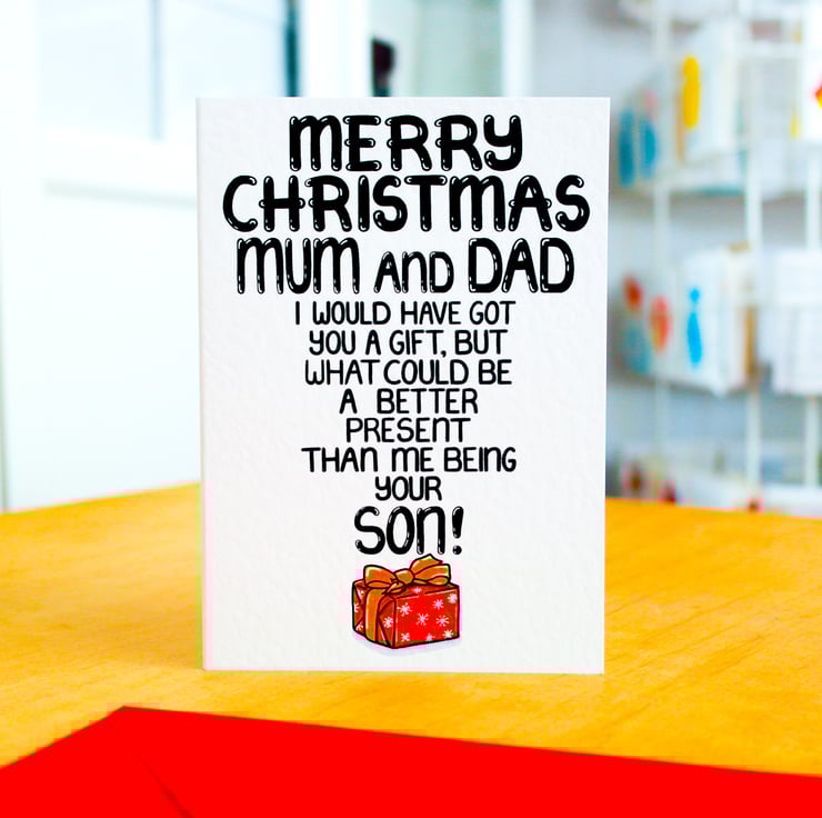 Greeting on front: MERRY CHRISTMAS MUM AND DAD I WOULD HAVE GOT YOU A GIFT, BUT WHAT COULD BE A BETTER PRESENT THAN ME BEING YOUR SON!