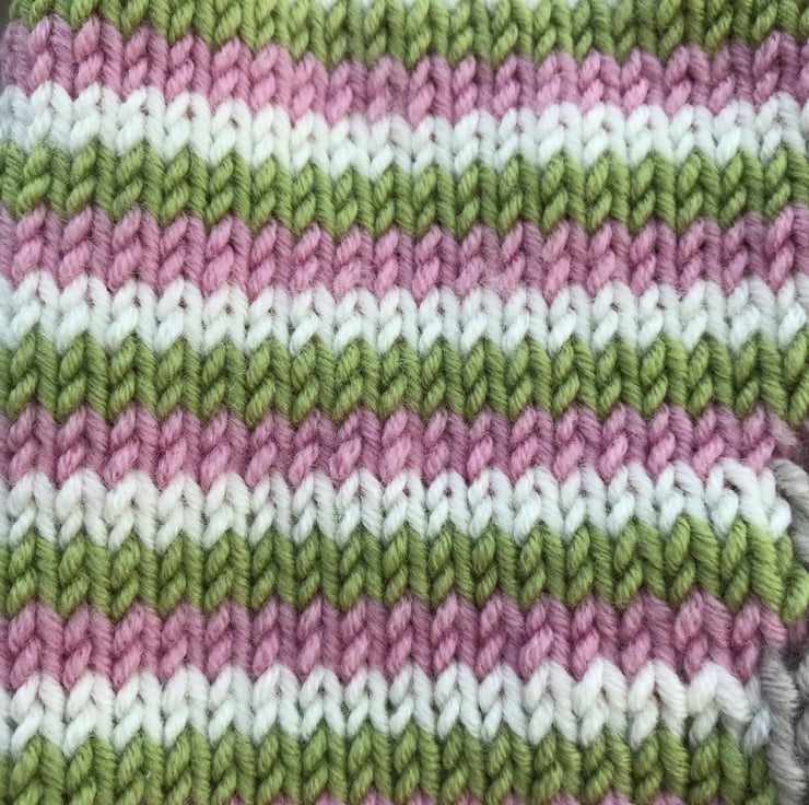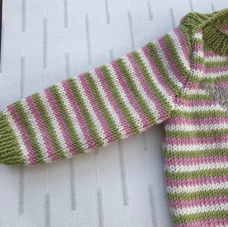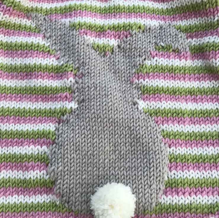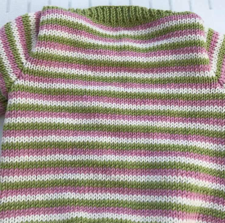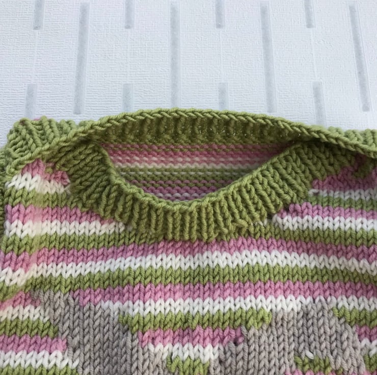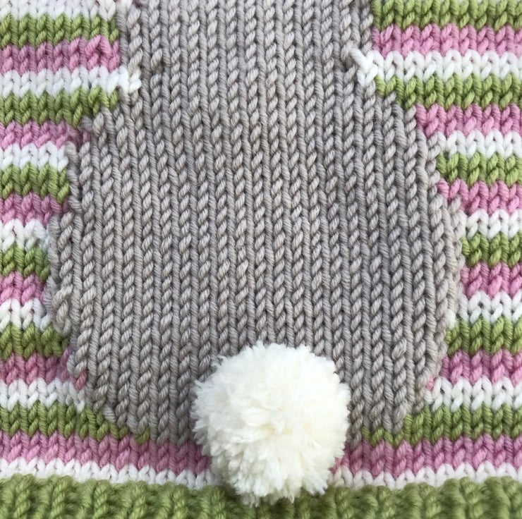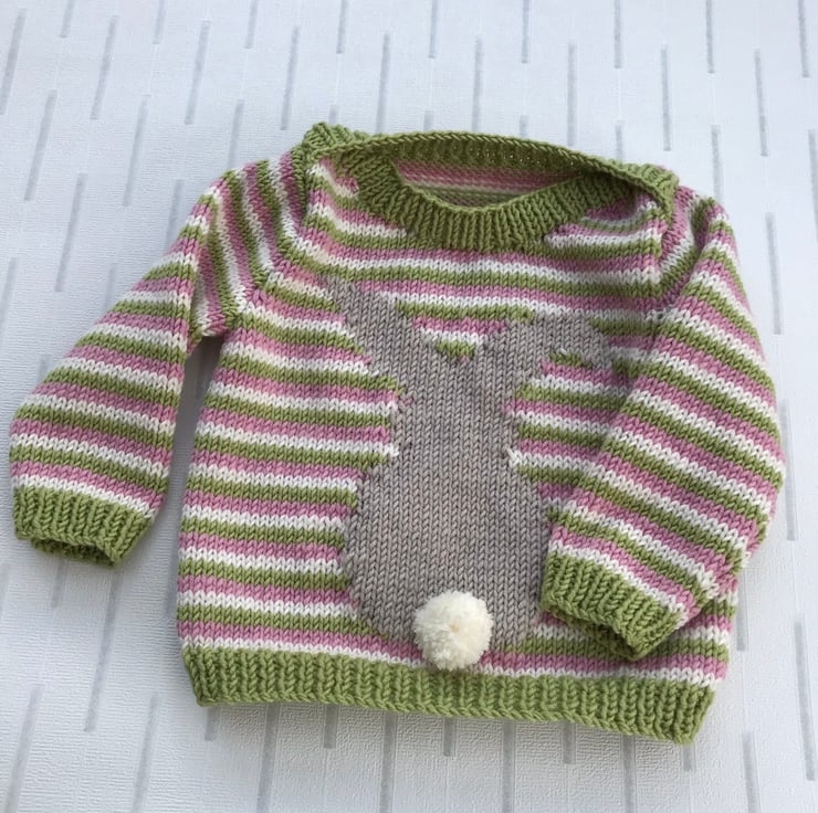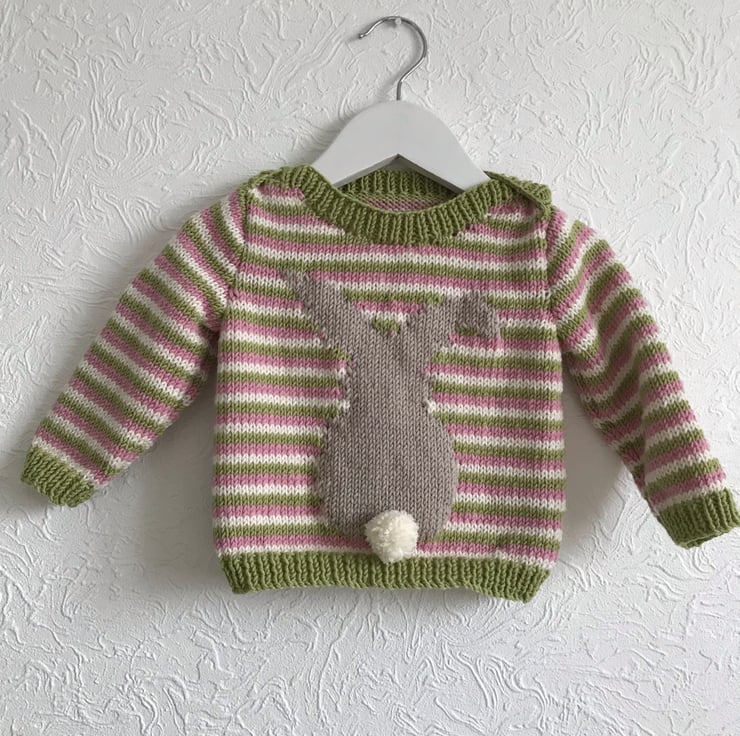 This jumper is hand knitted in a soft wool. The stripes are worked in apple green, pink and cream. The front features a rabbit silhouette worked in stone with a cream pompom for the tail. The ribs are green and the neckline is envelope style making it easy to pull on.