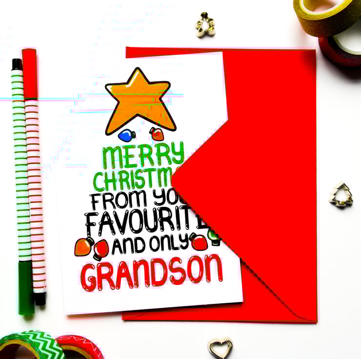 Greeting on front: MERRY CHRISTMAS FROM YOUR FAVOURITE AND ONLY GRANDSON