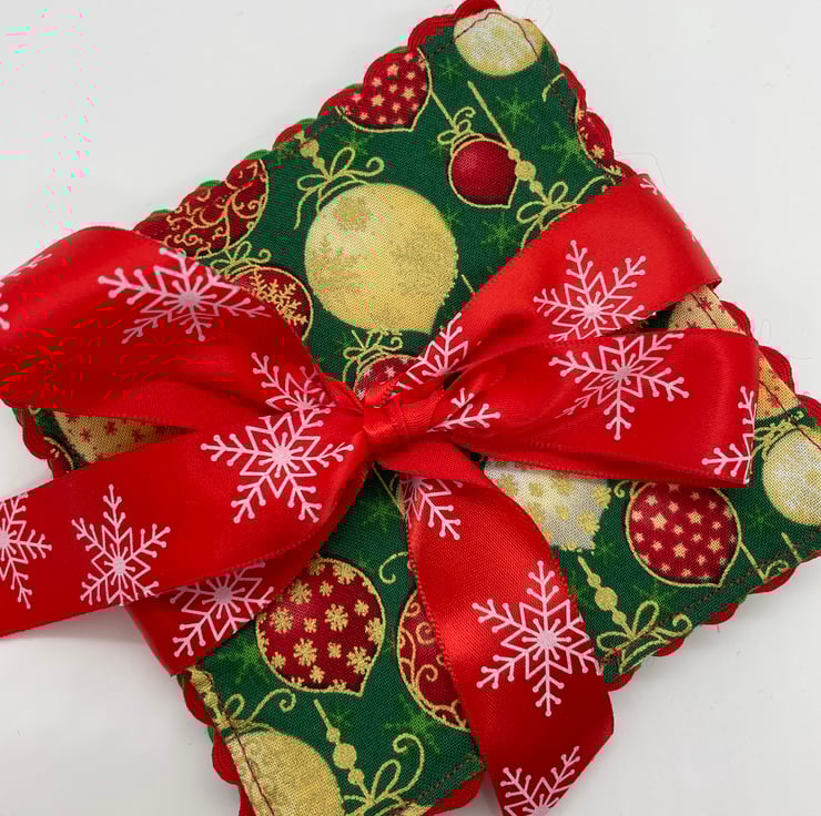 Set of four coasters made from Christmas fabric and edged with decorative trim.