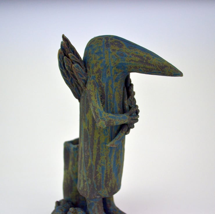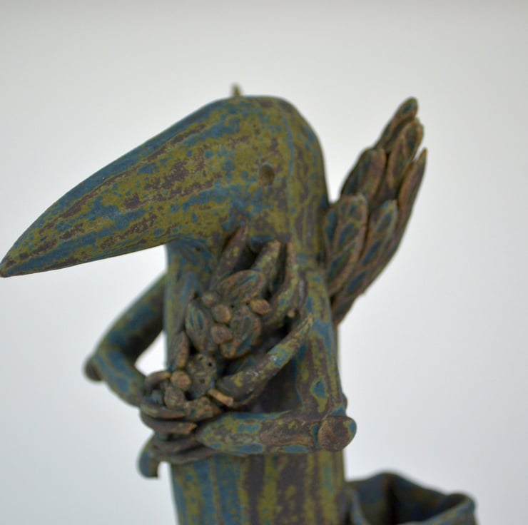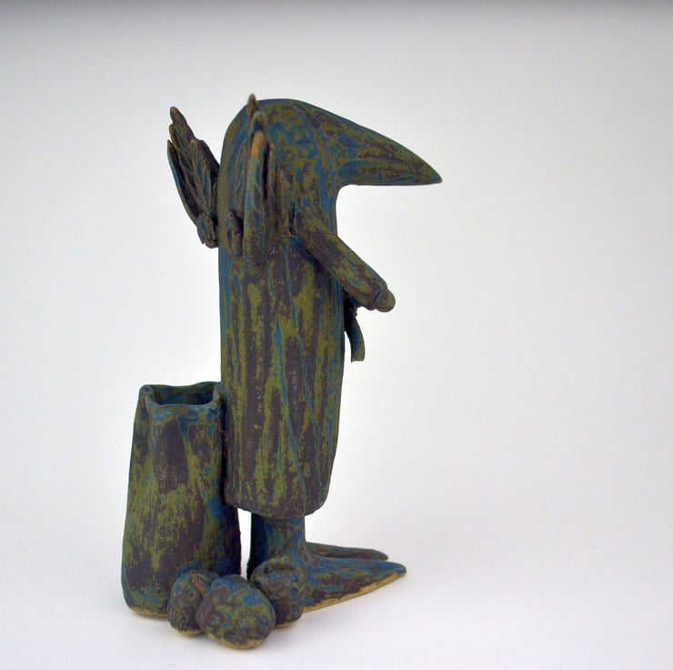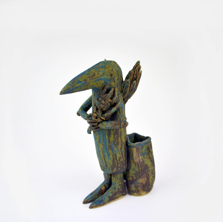 Standing just over 14cm high, with a sack and acorns at its feet, this sculpture is fired to stoneware and glazed in a lovely dry but quietly flamboyant glaze.