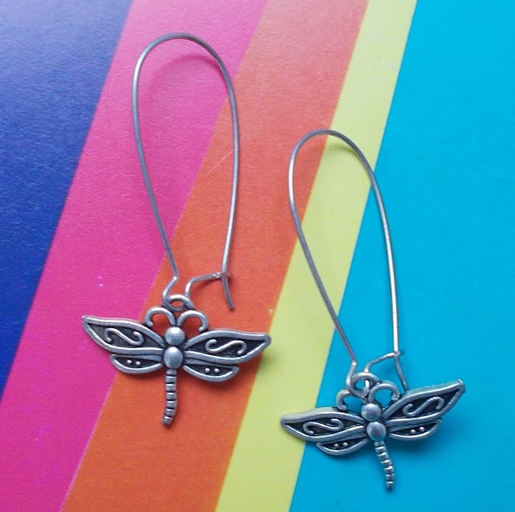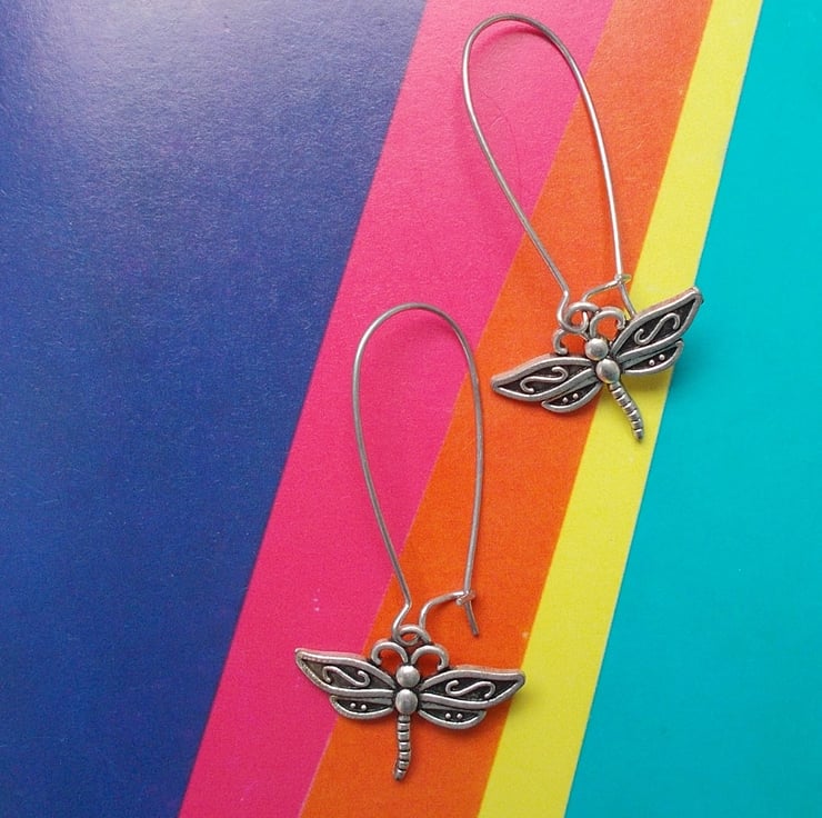 Beautiful dragonfly earrings, Tibetan silver dragonflies hanging on sterling silver nickel free hoop and hook earrings. For dragonfly lovers everywhere. Free UK postage.
