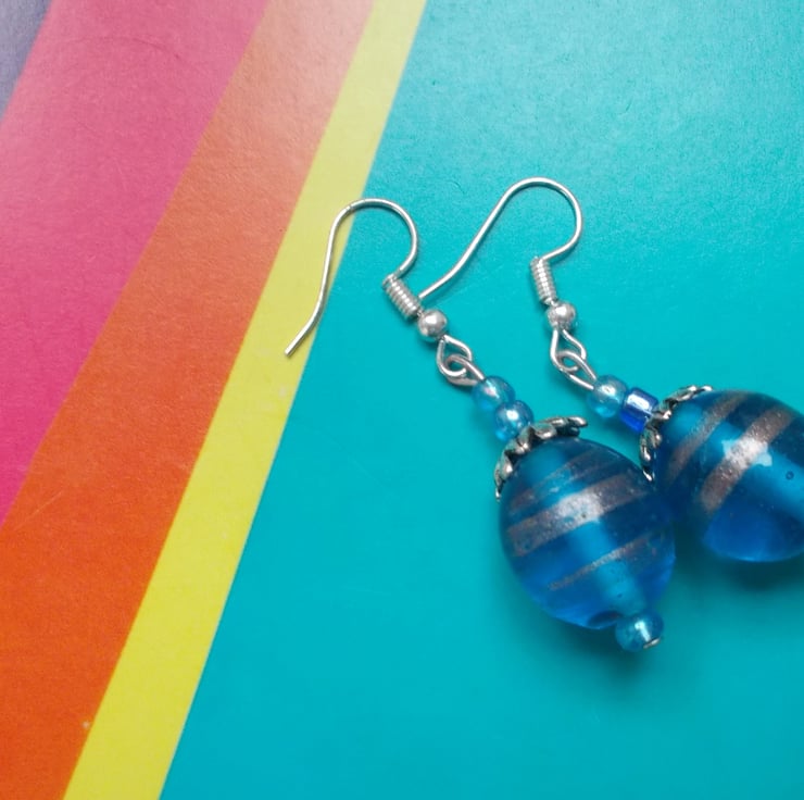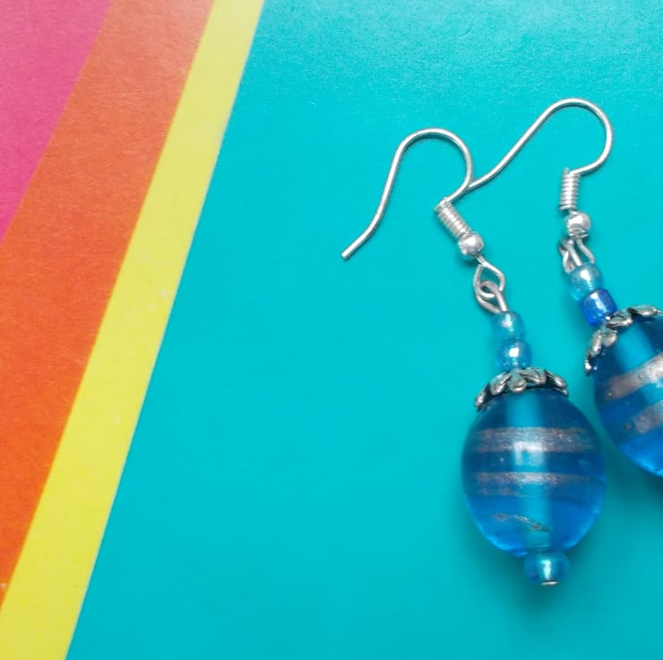 Such lovely earrings made with recycled beads. Beautiful oval shaped blue glass beads with a silver stripe painted around with tiny glass beads in shades of blue and small Tibetan silver spacer beads. Hanging on sterling silver nickel free hooks.