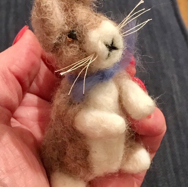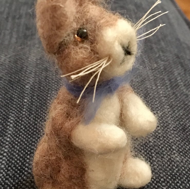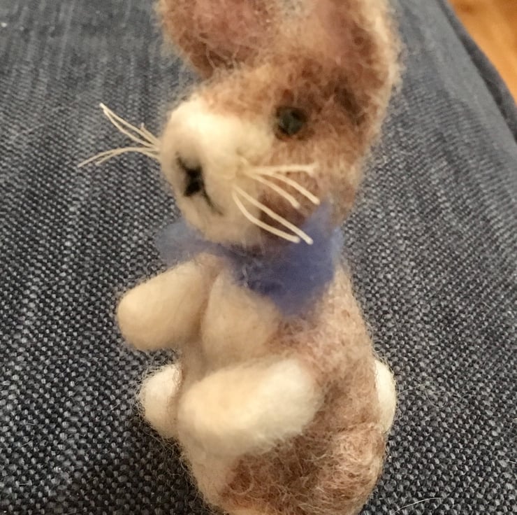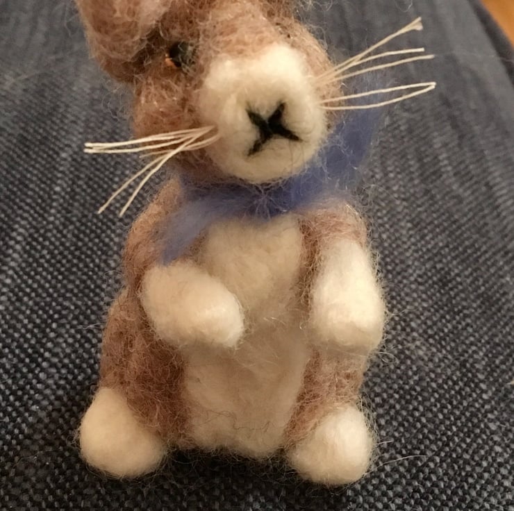 This is a little rabbit that has been needlefelted wearing a blue scarf and has little glass eyes.