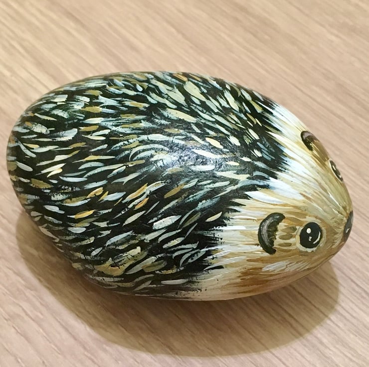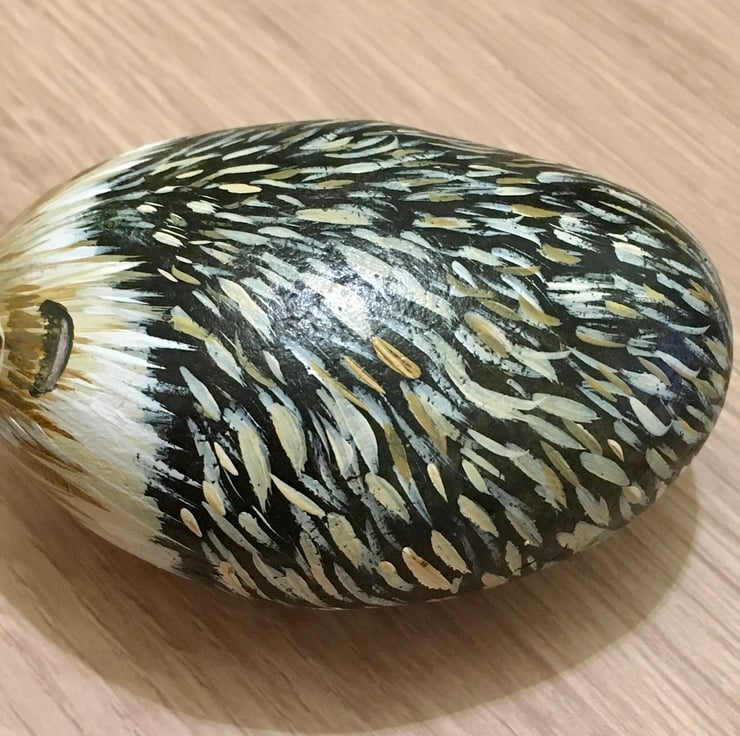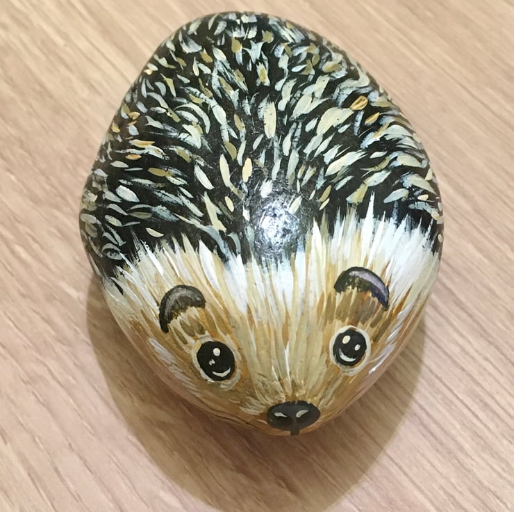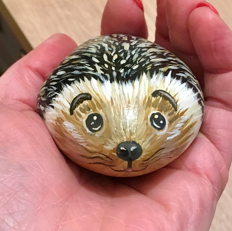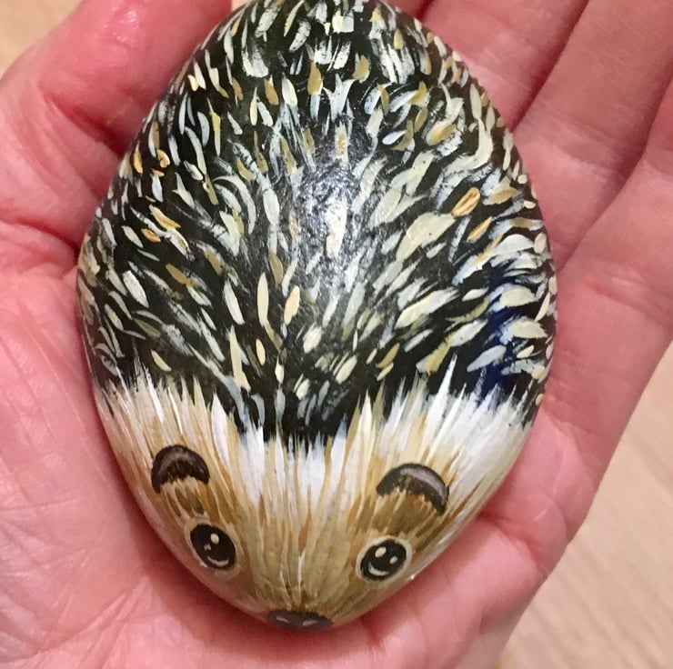This hedgehog has been painted onto a smooth stone and glazed for a glossy protective finish