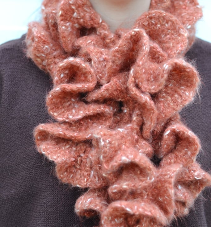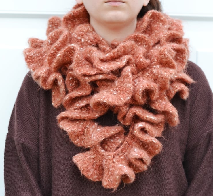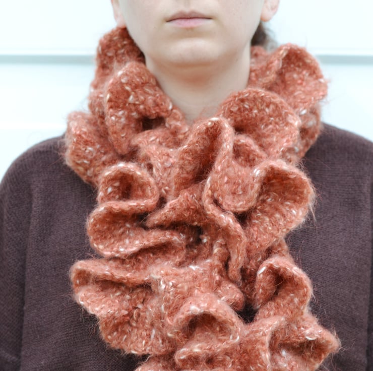 Hand crochet ruffle scarf in a lovely wool mix and mohair yarn. Made in a lovely salmon shade with white flecks. A long length which can be worn various ways.