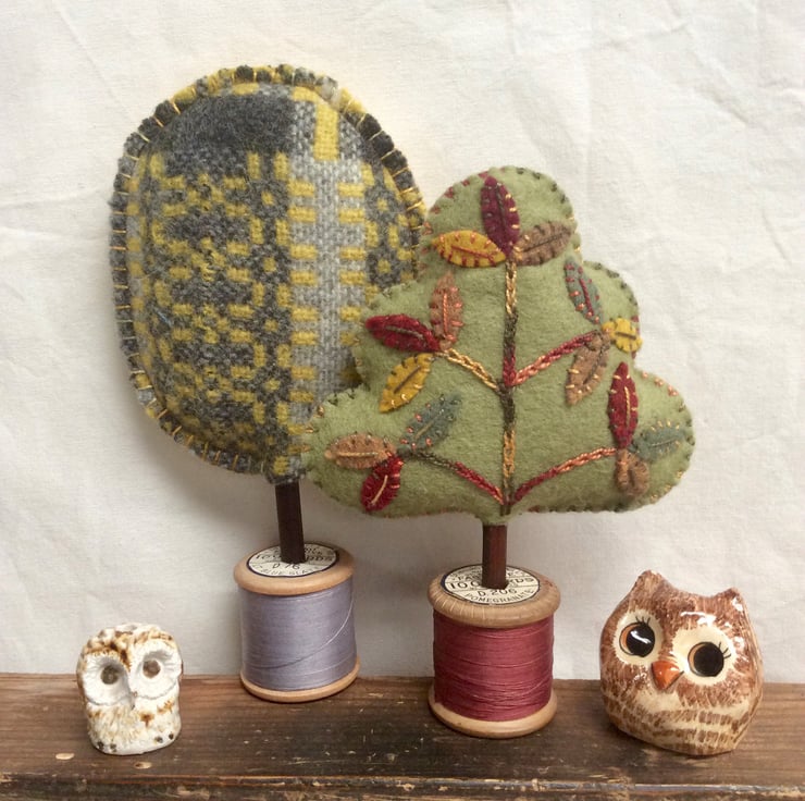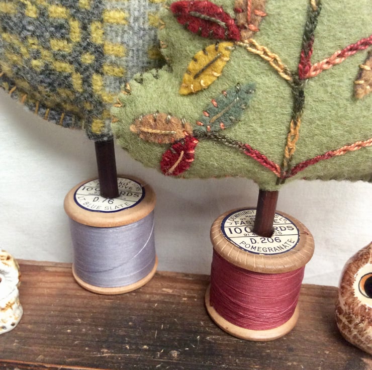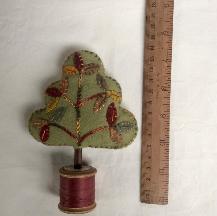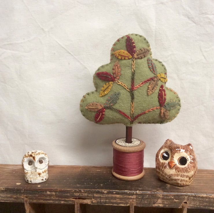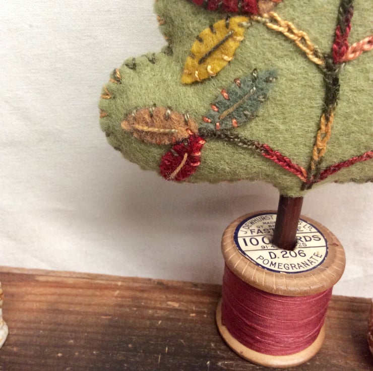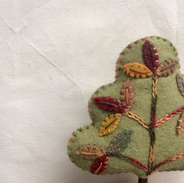 My own design, everyone is different and quirky. Hand stitched felt appliqué leaves with wonderful variegated pearle thread.