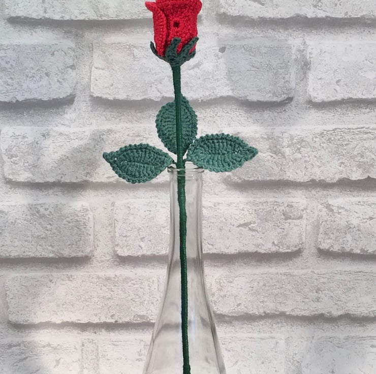 These handmade single stem crochet red rose buds have been made from 100% cotton yarn. These have 4 petals with wire added into them as well as the leaves to give them shape. Each one is approximately 32cm in length using wooden skewers which have been covered with green wool.