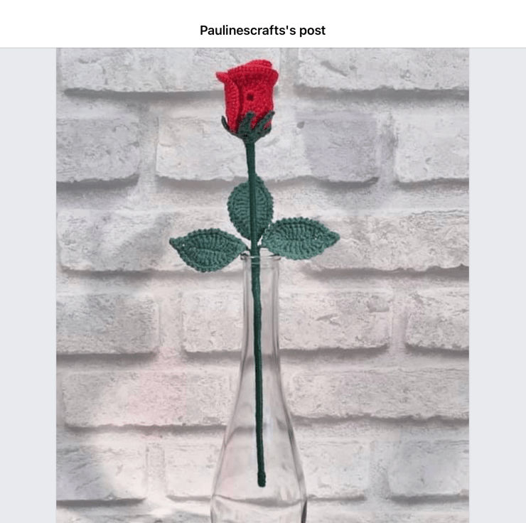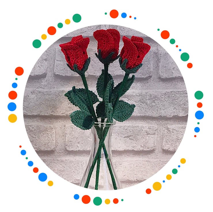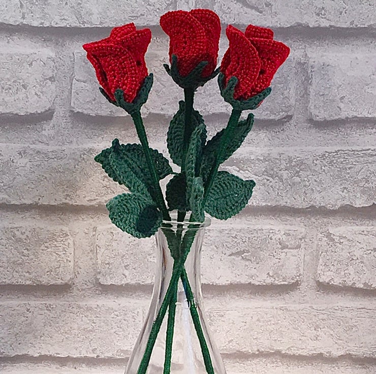 These handmade single stem crochet red rose buds have been made from 100% cotton yarn. These have 4 petals with wire added into them as well as the leaves to give them shape. Each one is approximately 32cm in length using wooden skewers which have been covered with green wool.