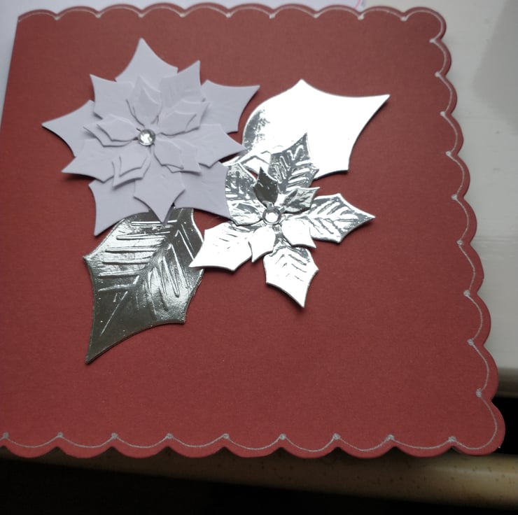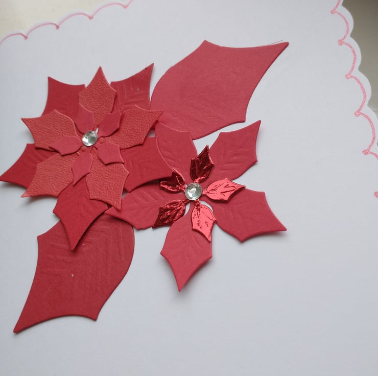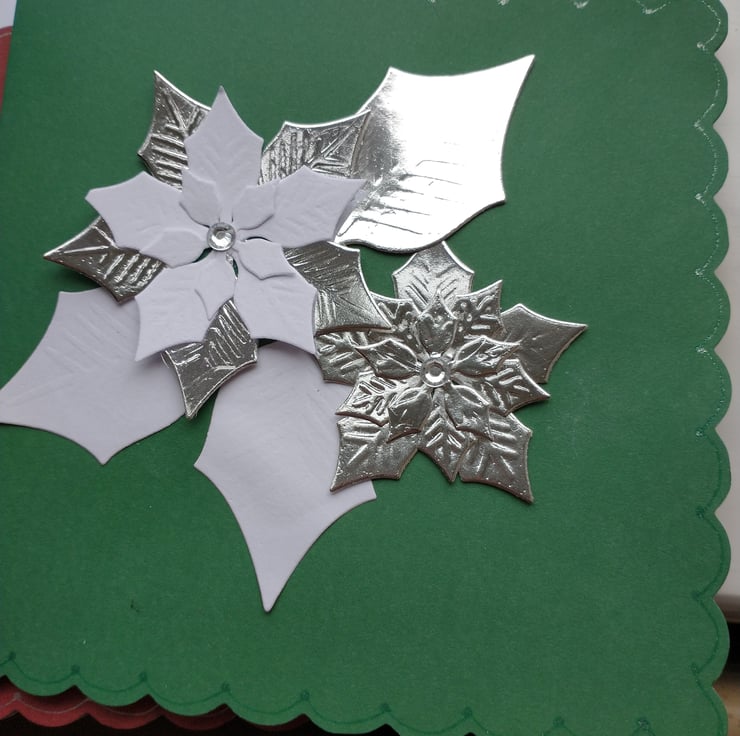 A pack of 5 Christmas cards, same design different colourways. Completely handmade and unique. 2 poinsettia flowers and leaves. Embellished with silver Rhinestones.
