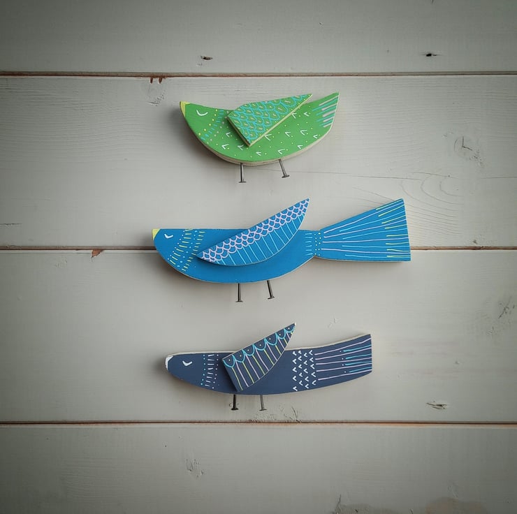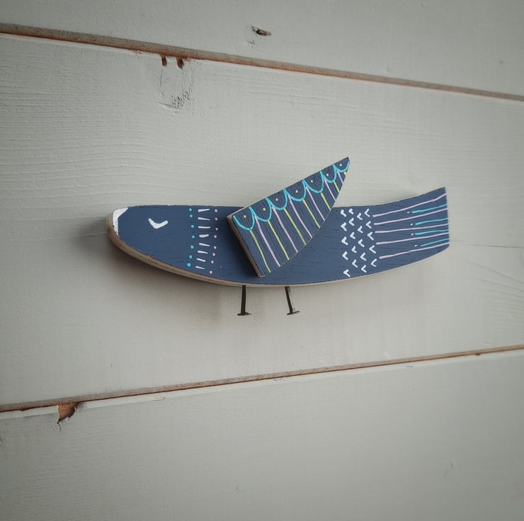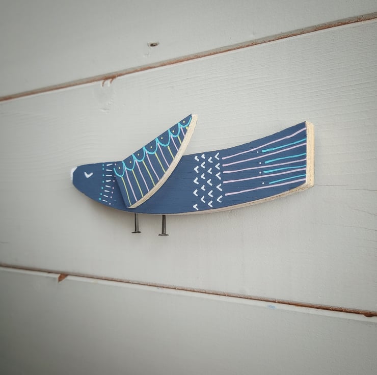 This folky wooden bird has been cut from 9mm plywood, painted navy blue and decorated with turquoise, pink, yellow and white. It has nails for legs and picture hook on the back to hang it on the wall. It is handmade from reclaimed materials giving it a 'naive' look. It measures approx 13cm at its longest point, and needless to say is inspired by my love of birds!