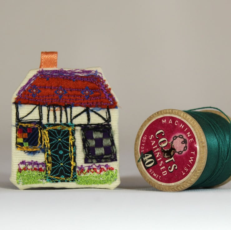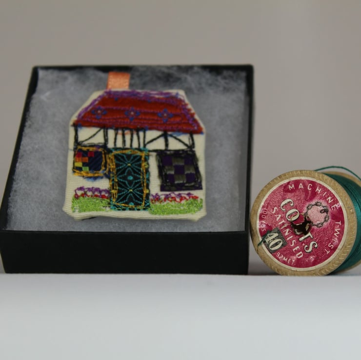 A quirky house brooch made with silk remnants from the silk weaving factory in Sudbury Suffolk. Tiny details are added with free motion machine embroidery. The back is lined and there is a brooch back pin. It measures 5 x 5 cm and comes in a black box.