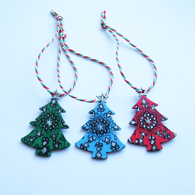 They have been hand painted with acrylic paint in blue, red and green. They are hand stamped in black permanent ink with a snowflake design and are double sided with silver highlights and a silver painted star on top of the tree.